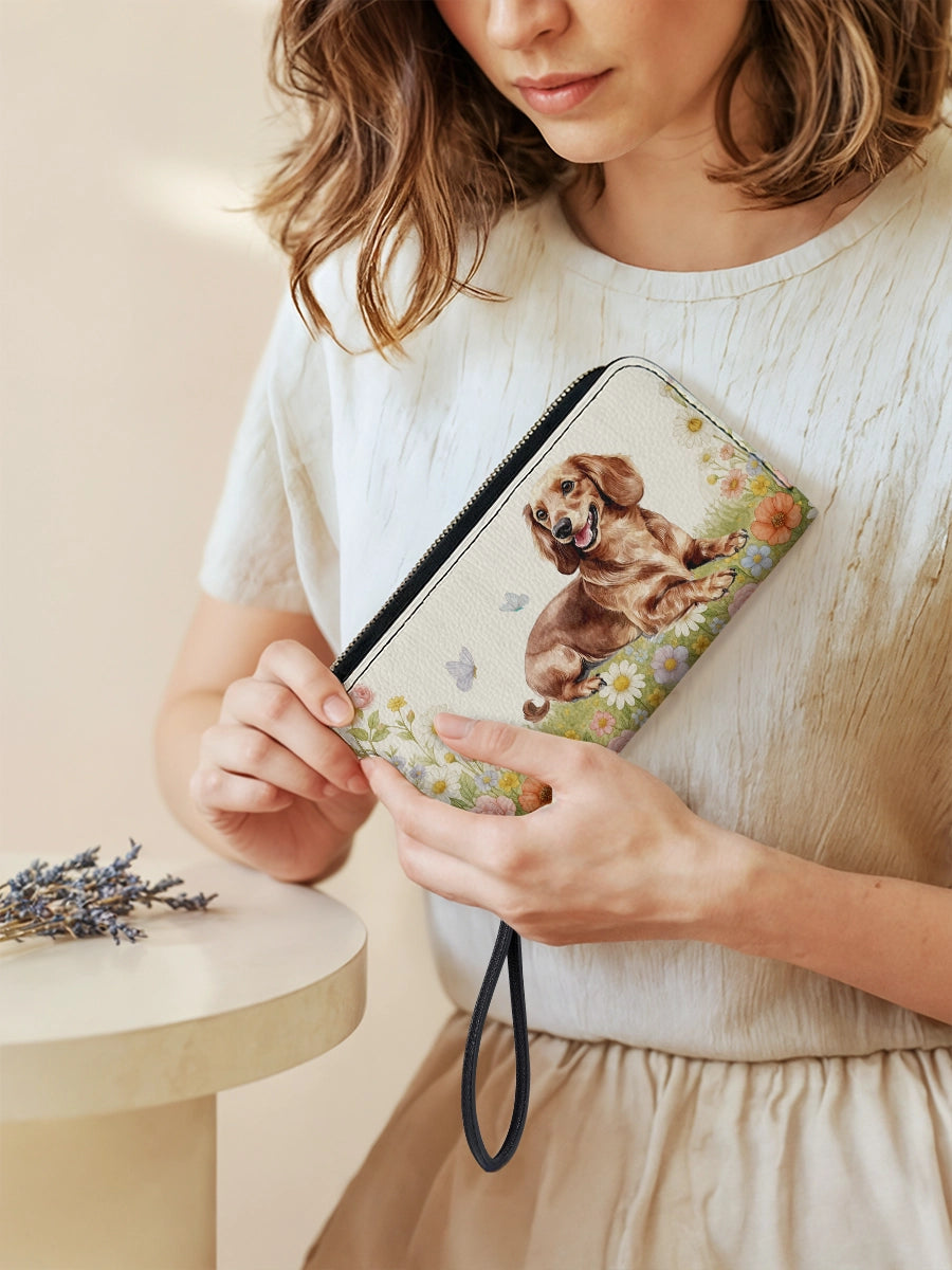 Sunny Meadow brings a breath of fresh air to your hands. With a smiling dachshund lounging in a floral-filled field and pastel butterflies dancing above, this clutch celebrates the sweet, simple moments of life.