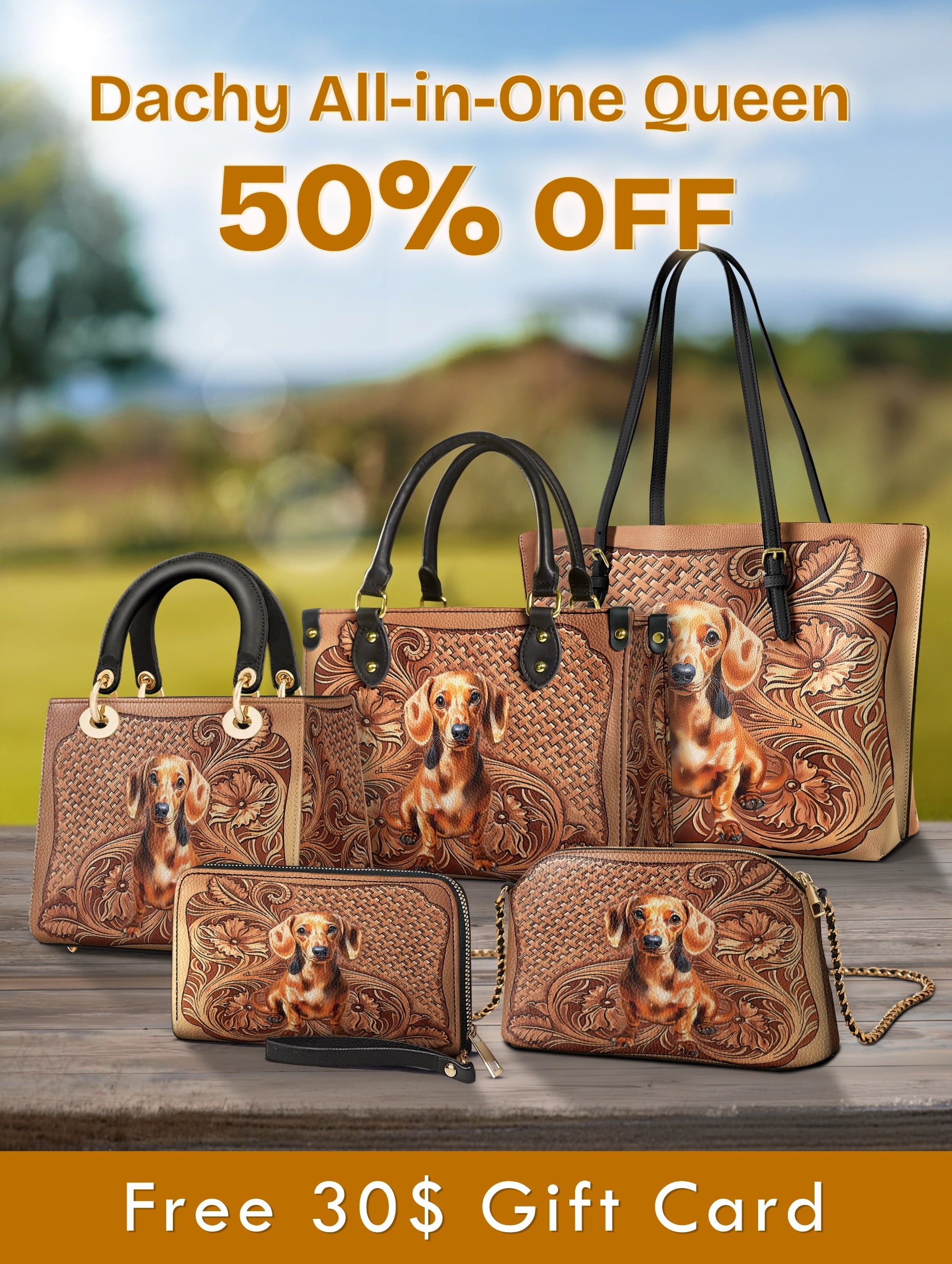 The leather bag is your everyday essential, the wallet keeps your cards and cash neatly in place, the crossbody is perfect for hands-free adventures, the tote carries it all with ease, and the lady bag brings a touch of refined charm. Together, they form the ultimate bundle — a stylish, practical, and joy-filled celebration of your dachshund love.