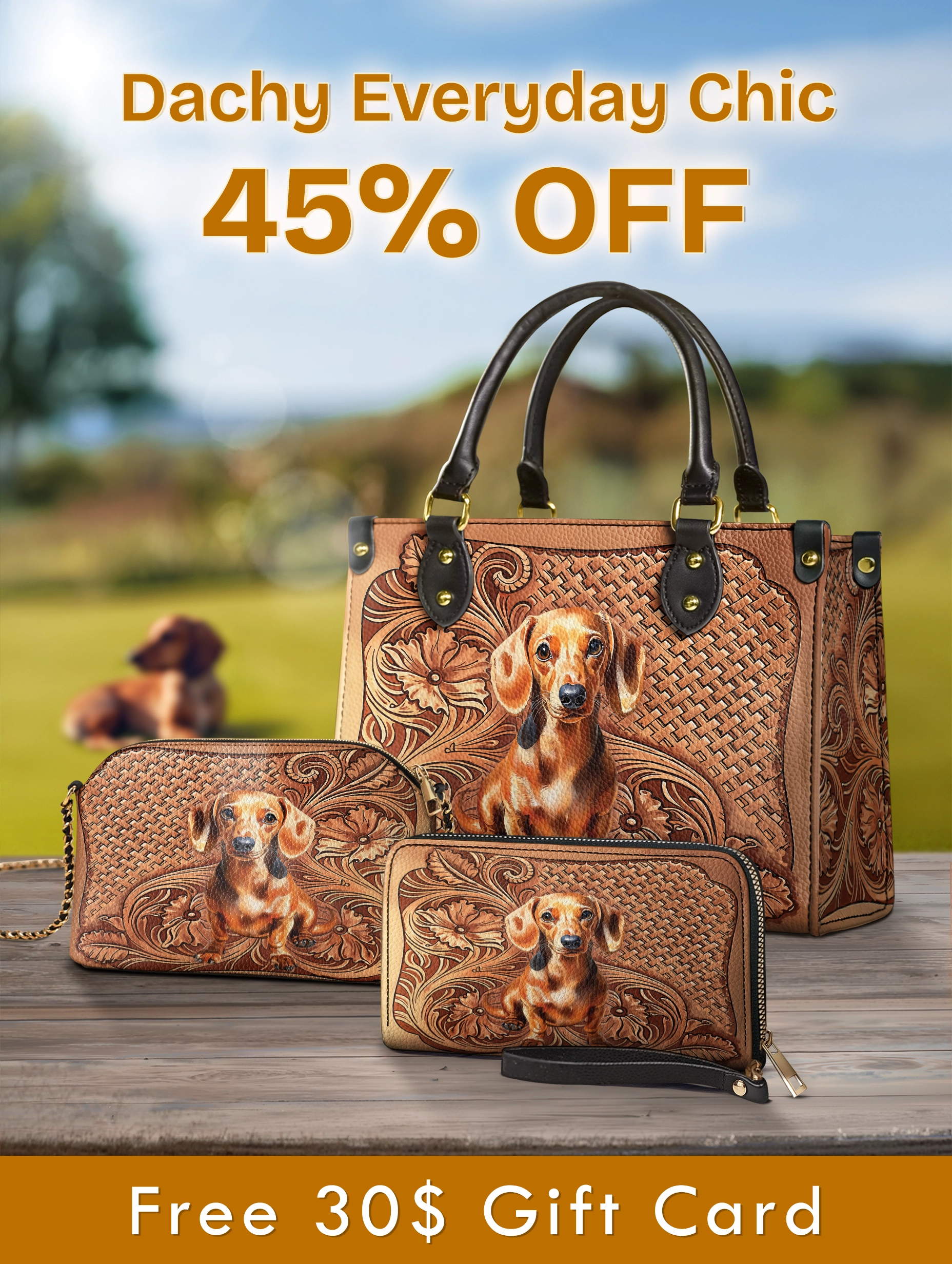 The DachyCharm Trio Bundle brings together our signature dachshund-pattern leather bag, a perfectly matching leather wallet, and a versatile leather crossbody — all crafted from premium leather that’s soft, durable, and color-fast to keep their beauty for years.