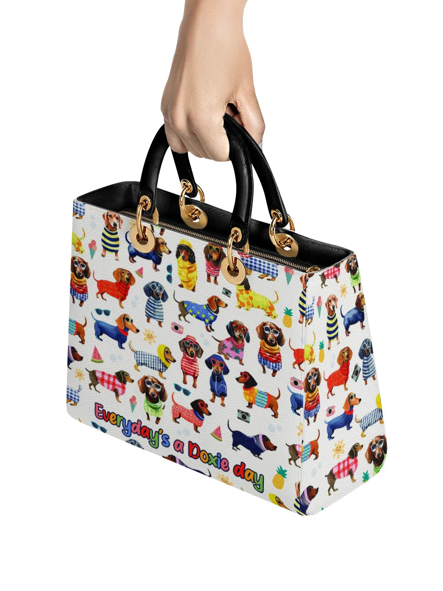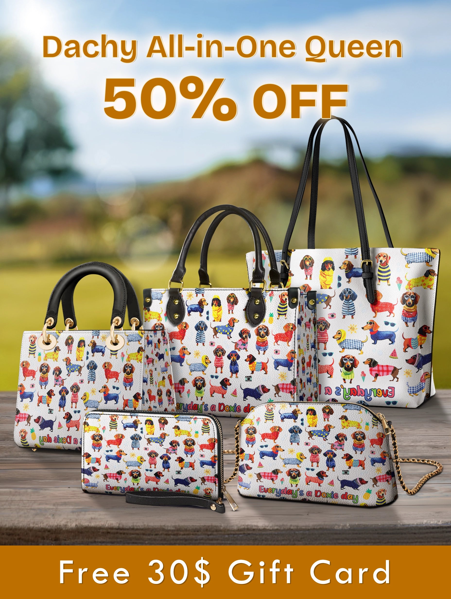 The leather bag is your everyday essential, the wallet keeps your cards and cash neatly in place, the crossbody is perfect for hands-free adventures, the tote carries it all with ease, and the lady bag brings a touch of refined charm. Together, they form the ultimate bundle — a stylish, practical, and joy-filled celebration of your dachshund love.