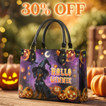 This magical leather bag features an adorable dachshund dressed as a starry witch, sitting under a glowing moon in a pumpkin-filled forest. Surrounded by carved jack-o’-lanterns and swirling purple mists, the bold “HalloWinnie” lettering adds a playful twist to Halloween night.