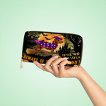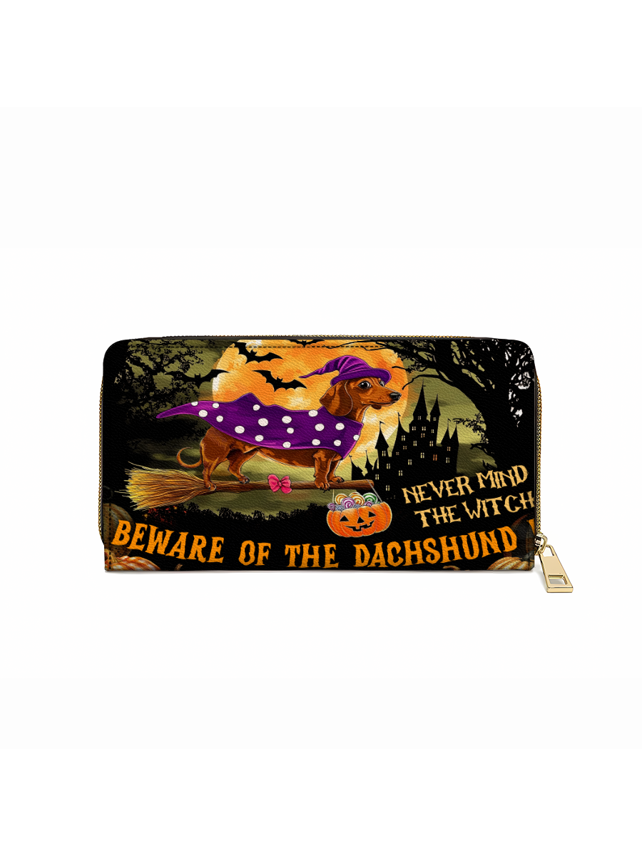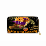 This bold leather wallet puts a spooky twist on sass - featuring a fearless dachshund witch flying under a harvest moon with her broom, cloak, and signature side-eye. Surrounded by bats, pumpkins, and a haunted castle, it’s a cheeky take on Halloween magic.