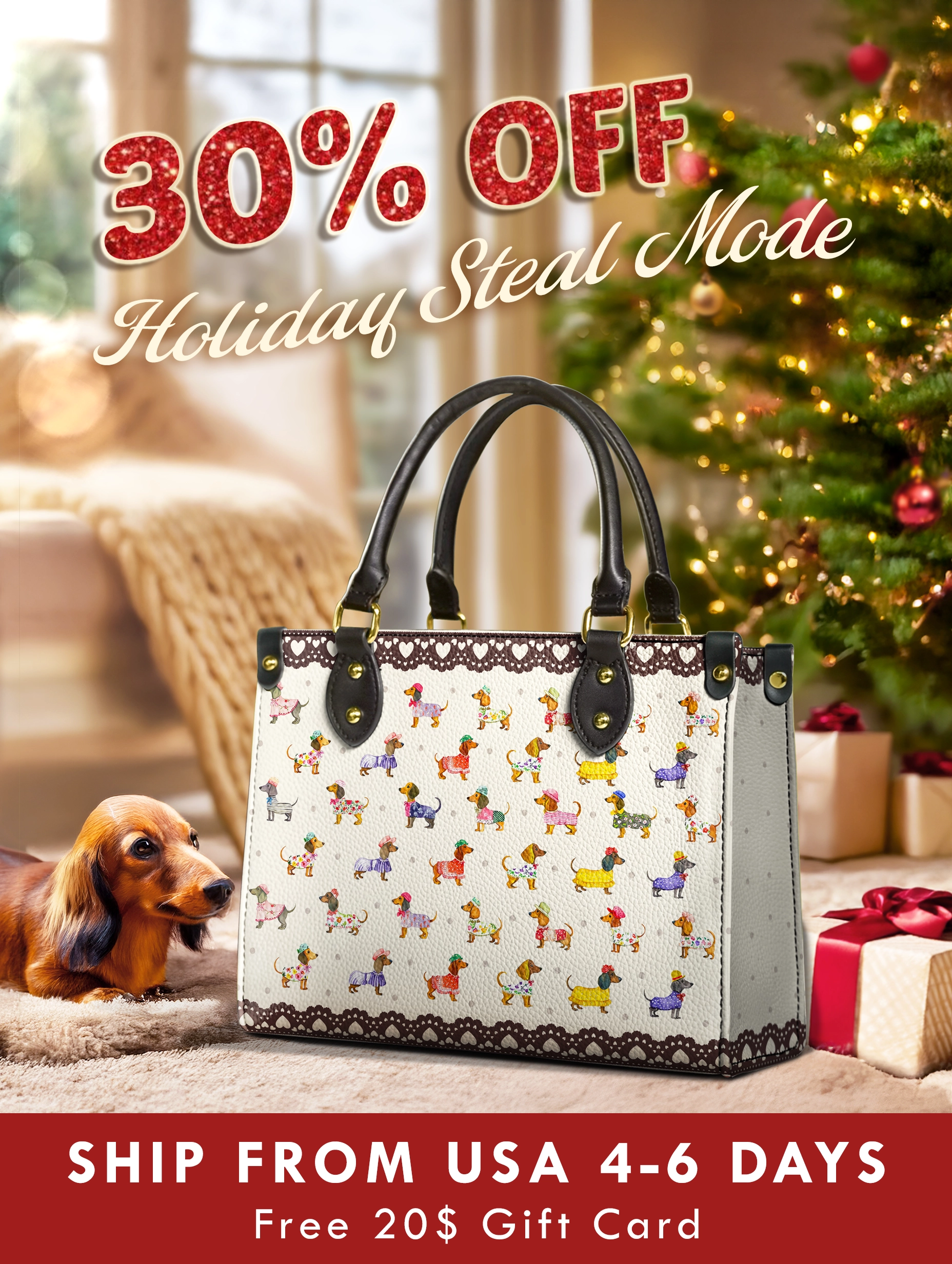Doxie Parade is a joyful fashion march of stylish dachshunds — each one dressed in its own quirky outfit, trotting across a creamy canvas framed with playful polka dots and lacey heart borders. With every step and color, this bag captures the cheerful chaos of dachshund personality and charm.