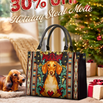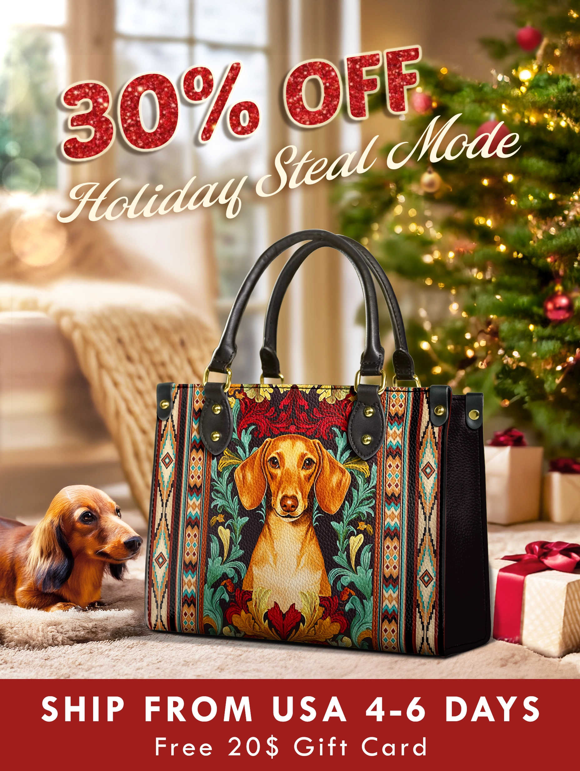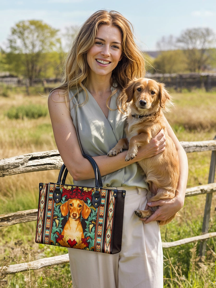 Doxie Spirit leather bag features an adorable dachshund nestled within a vibrant Western-tribal tapestry. Surrounded by bold patterns and earthy tones of terracotta, turquoise, and deep black, the artwork radiates charm, cheer, and a sense of joyful individuality.