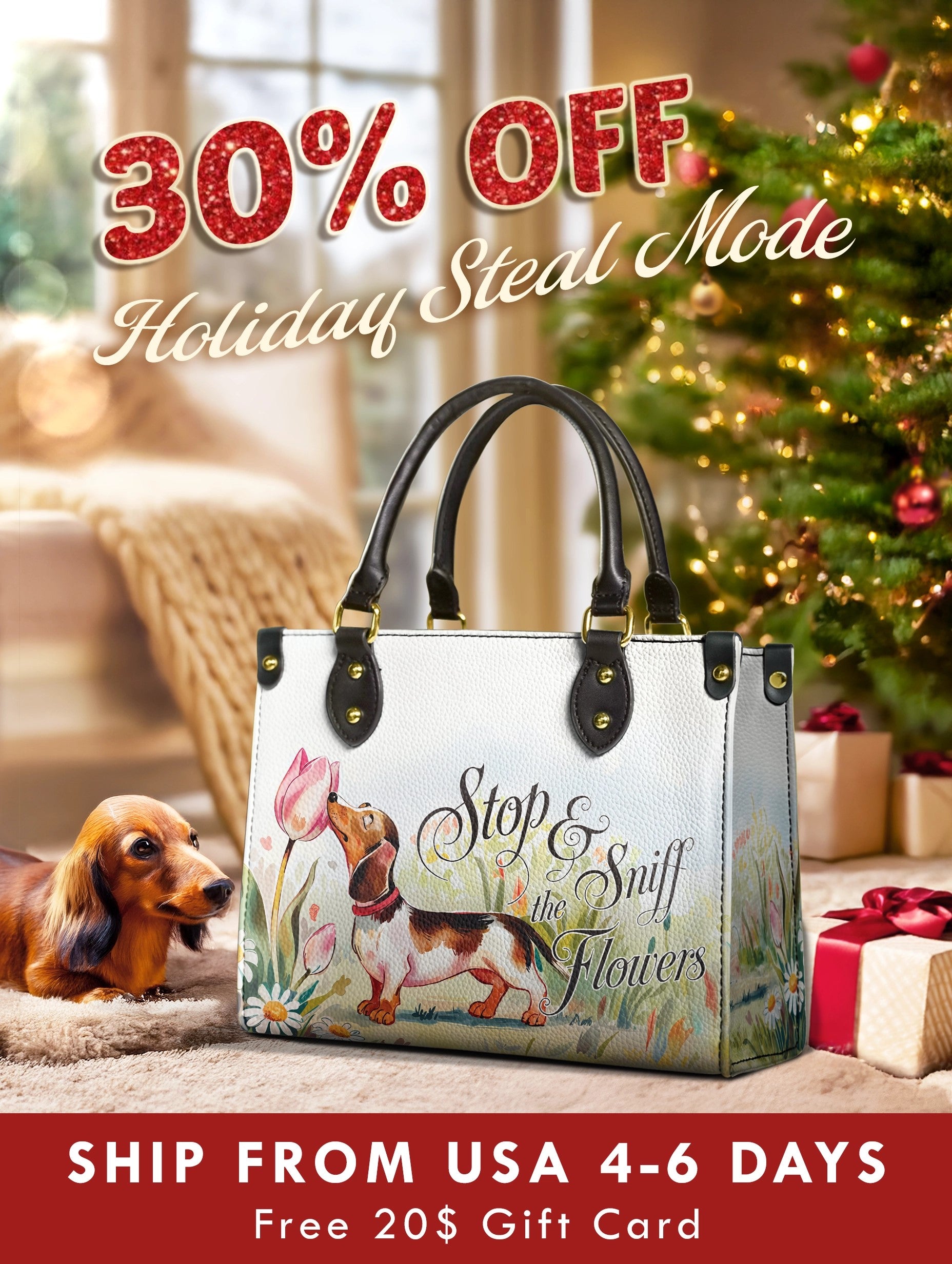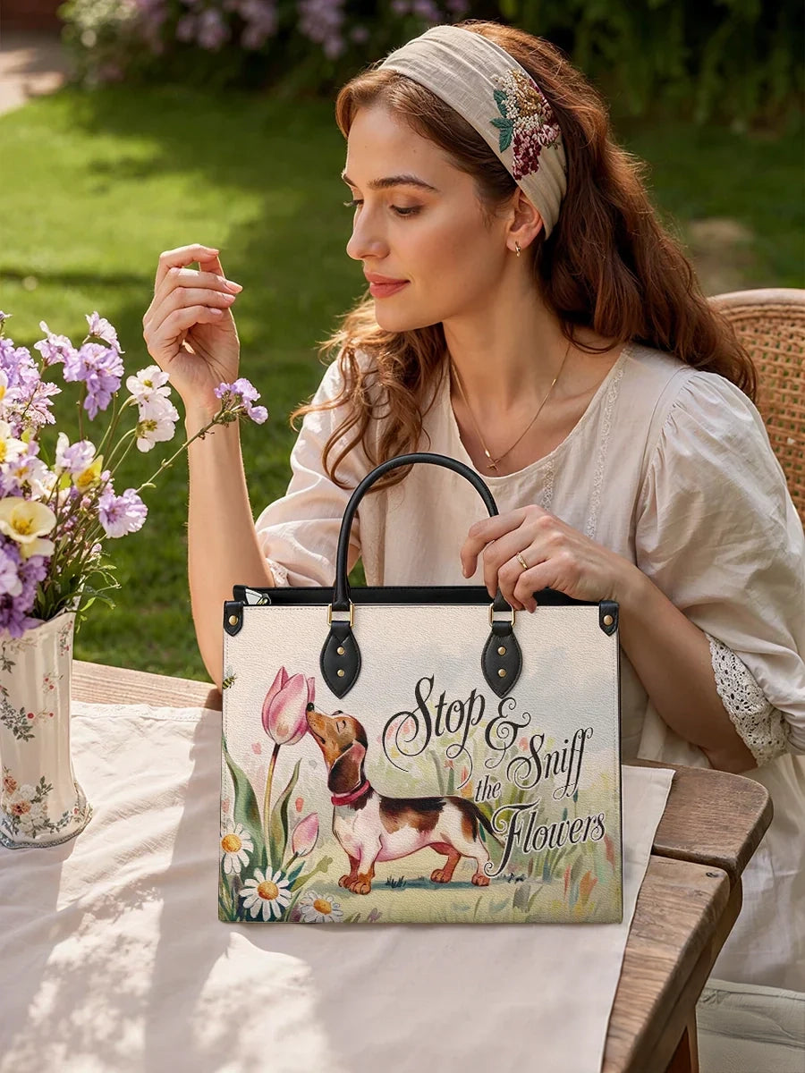 Let your day bloom with the Sniff Joy leather bag — a charming tribute to slowing down and savoring the little things. Featuring a sweet dachshund pausing to smell a tulip among a meadow of daisies, this design is both playful and poetic. The soft pastel background and whimsical script invite you to embrace joy, nature, and simplicity.