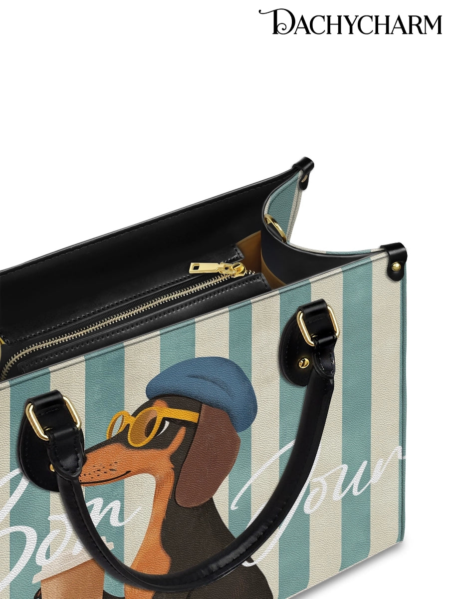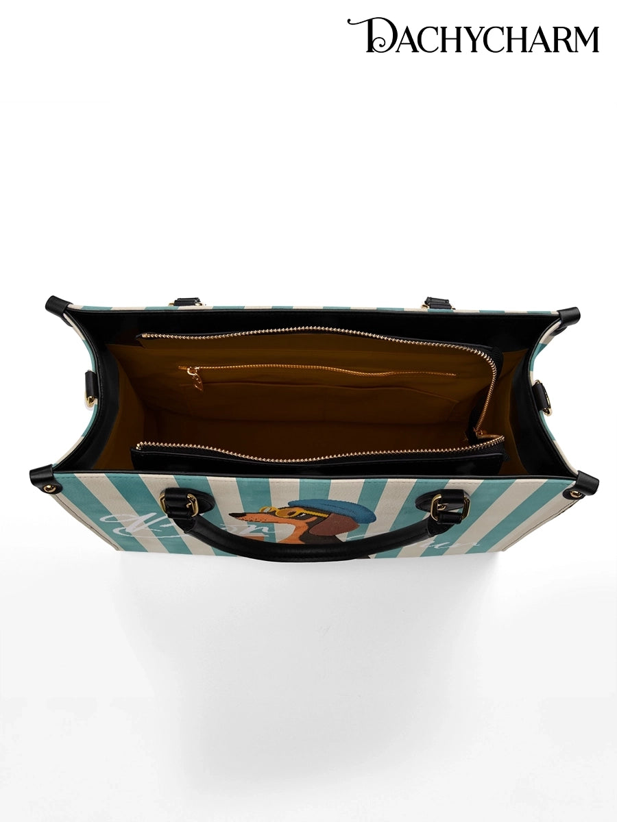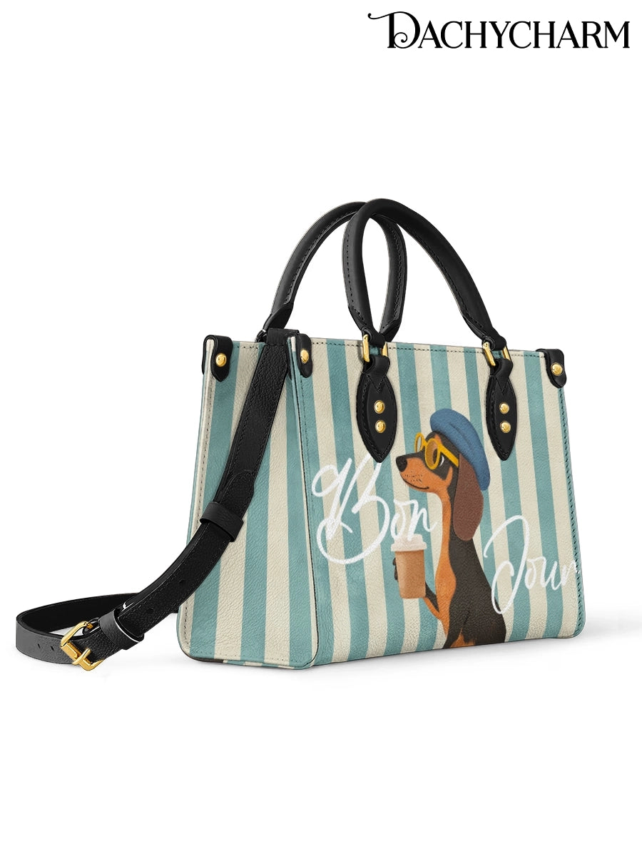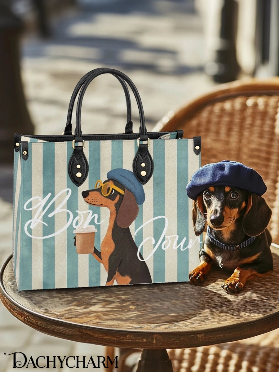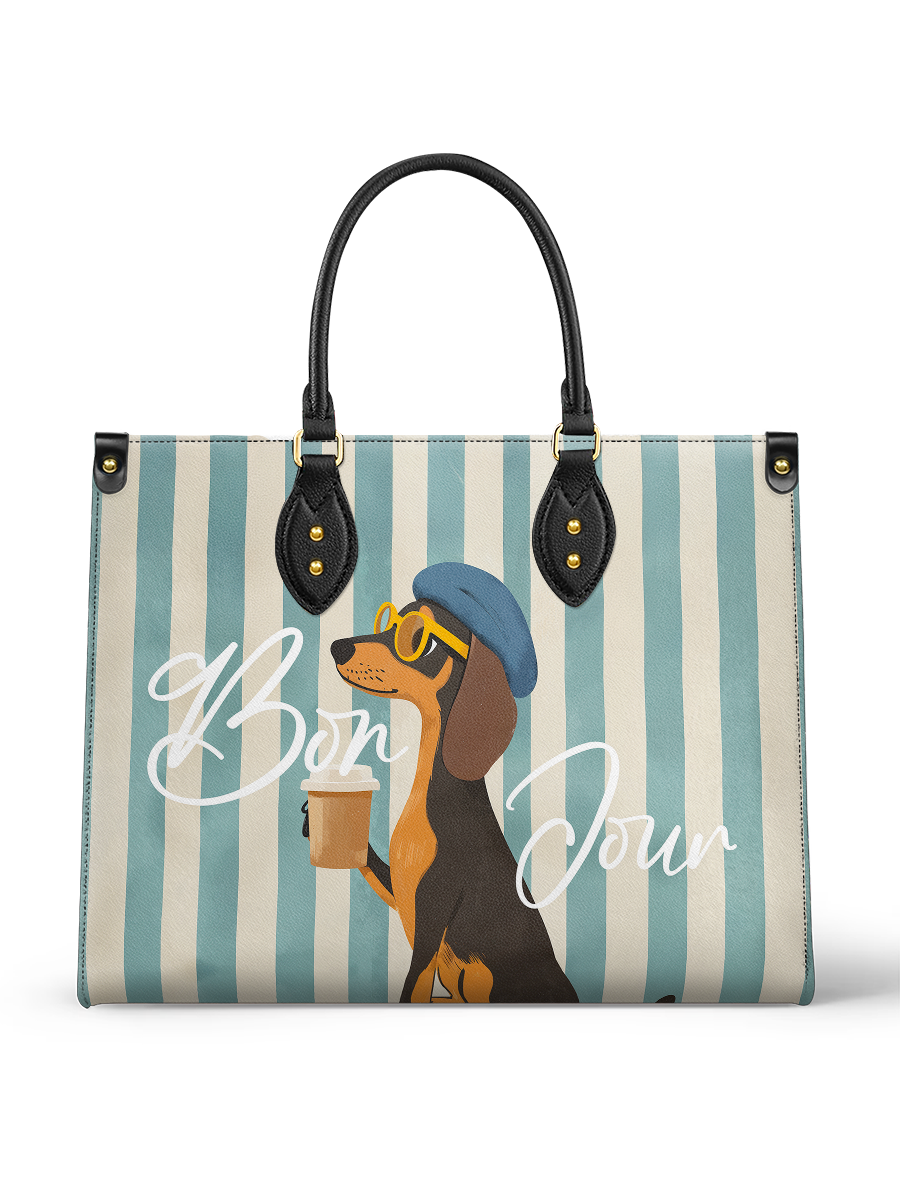 Say Bonjour to effortless charm. This chic leather bag showcases a Dachshund with undeniable Parisian flair — sporting a blue beret, retro sunglasses, and a to-go coffee cup, all set against vintage teal-and-cream stripes. It’s the kind of bag that turns sidewalks into cobblestone strolls and mornings into little moments of style.