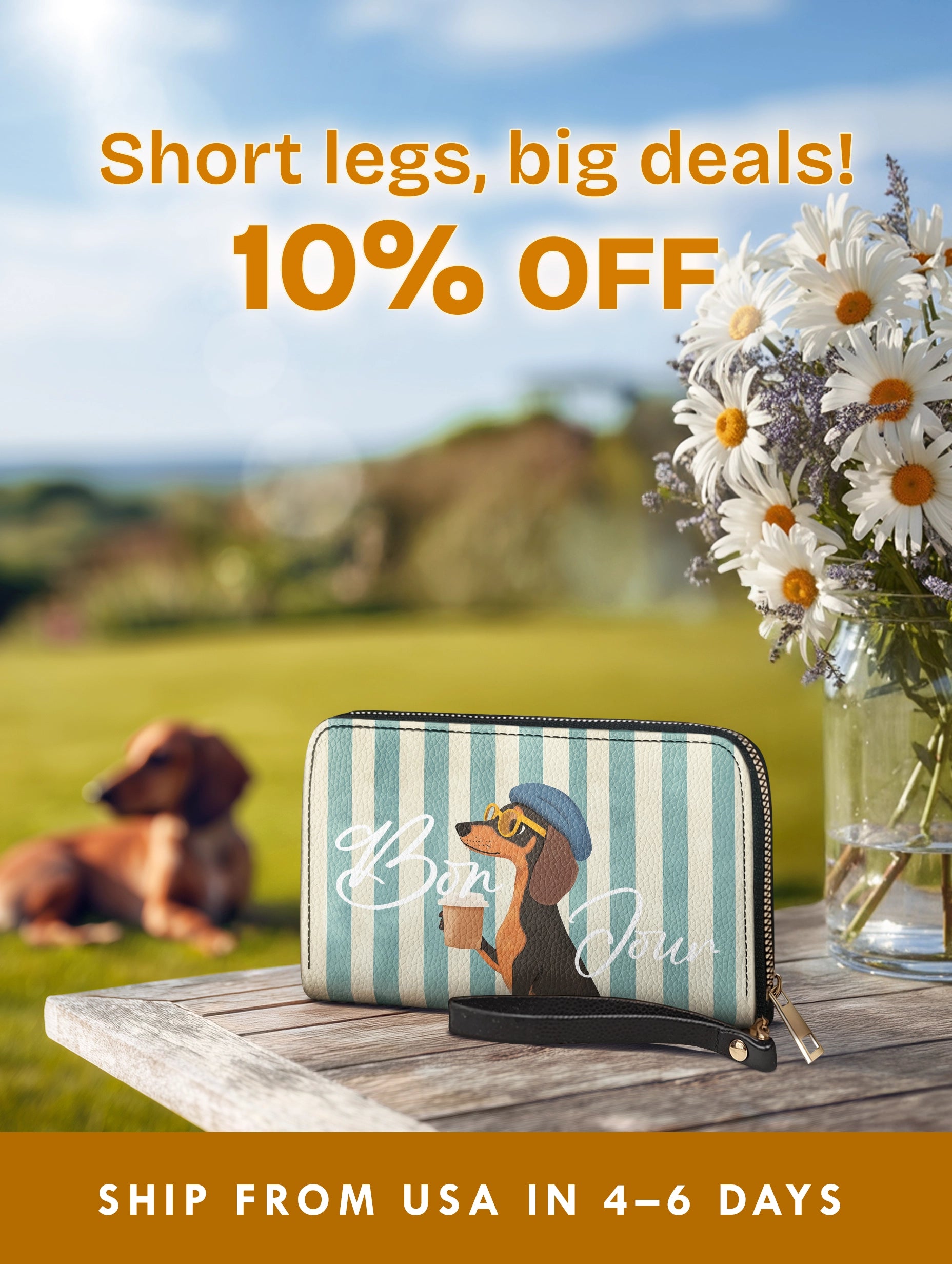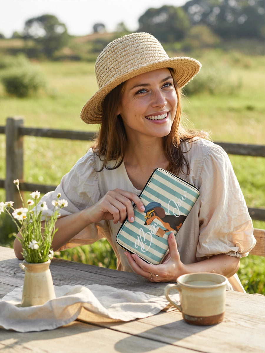 This compact leather clutch carries the same French-inspired whimsy, featuring the fashionable Dachshund against soft striped tones. Whether you're sipping lattes or heading out for a light afternoon, this clutch adds personality to your day — with just enough room for the essentials.