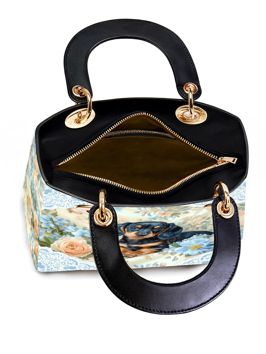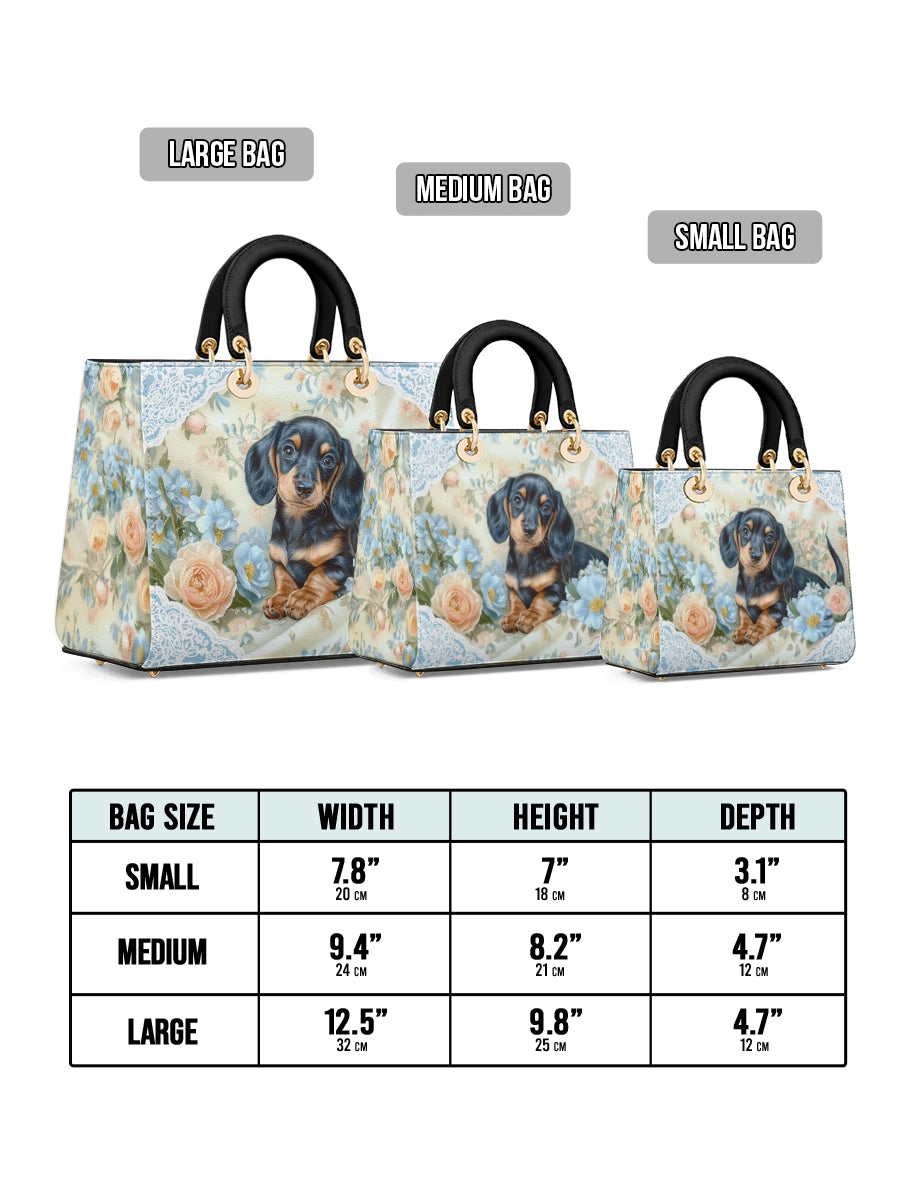The Lady Leather Bag by DachyCharm brings timeless elegance to everyday moments. With its structured silhouette, sturdy top handles, and charming details, it’s the perfect blend of grace and personality — made for dachshund lovers who adore a touch of sophistication.