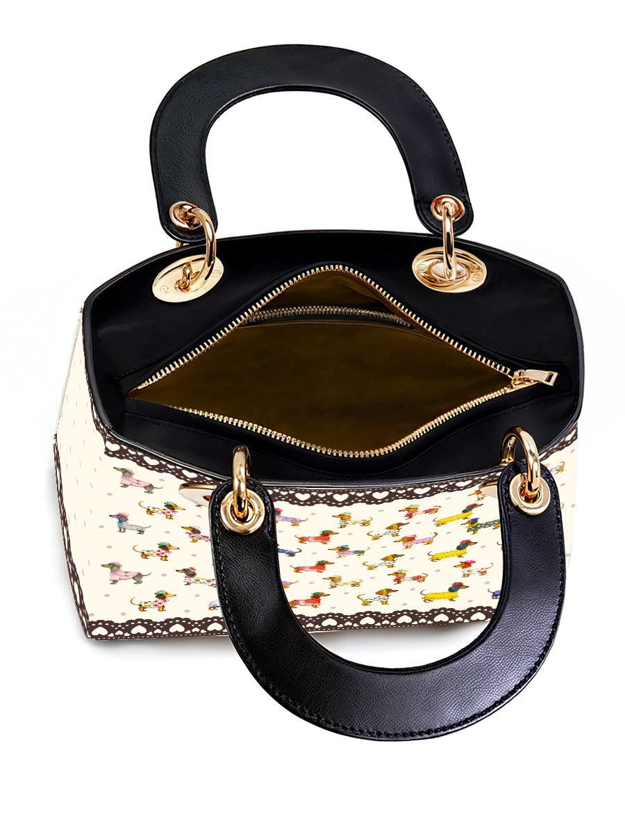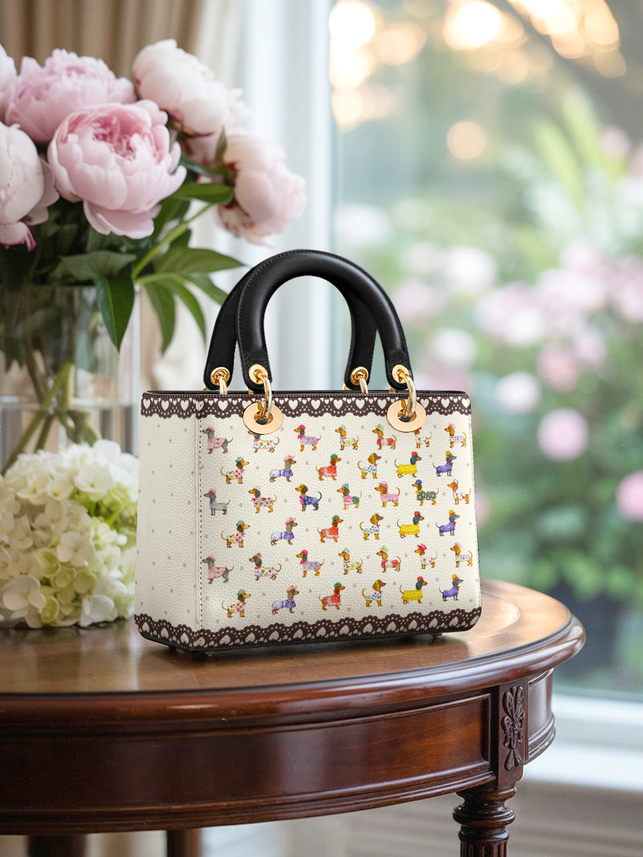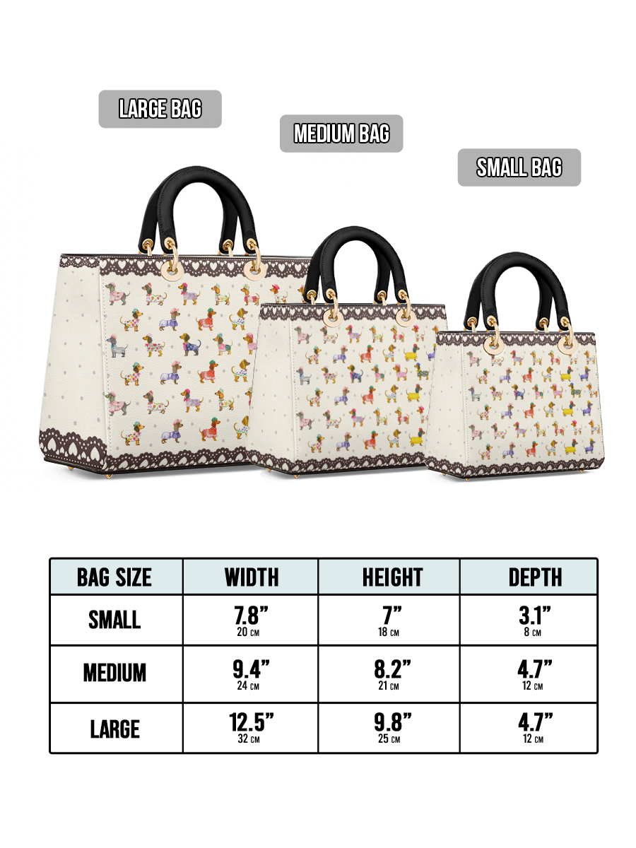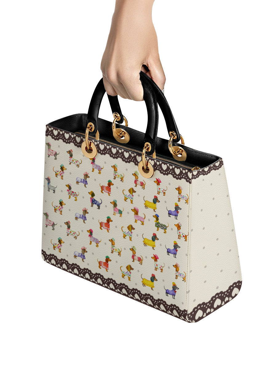 The Lady Leather Bag by DachyCharm brings timeless elegance to everyday moments. With its structured silhouette, sturdy top handles, and charming details, it’s the perfect blend of grace and personality — made for dachshund lovers who adore a touch of sophistication.