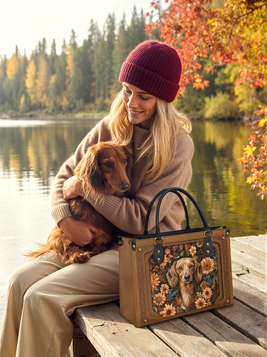 Autumn Gaze is a rich tapestry of earthy elegance — a soulful dachshund surrounded by warm-toned daisies and rustic foliage, all framed in a tooled leather-inspired border. The deep browns, amber golds, and forest greens bring a quiet depth, like a crisp fall afternoon wrapped in love.