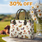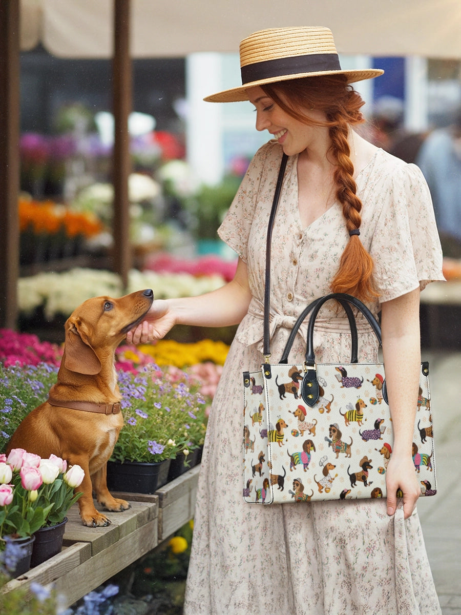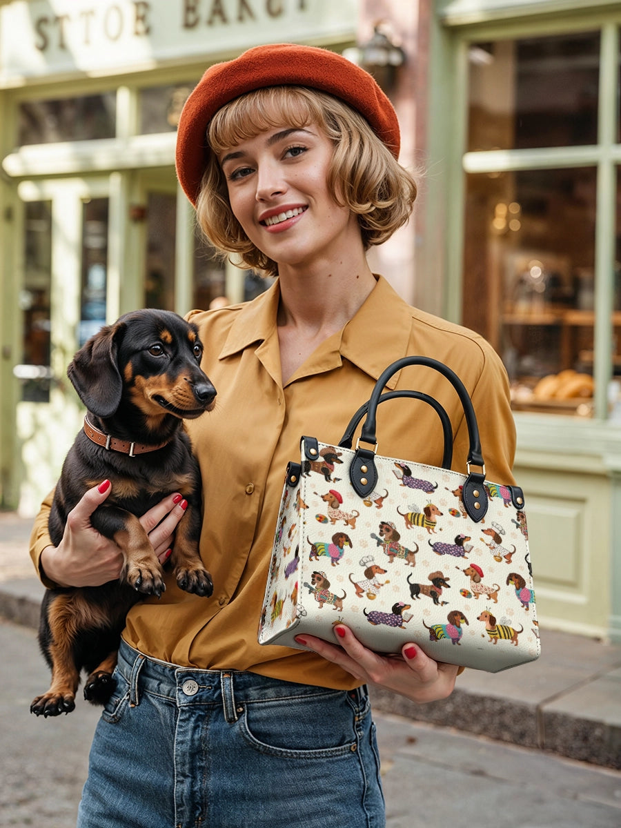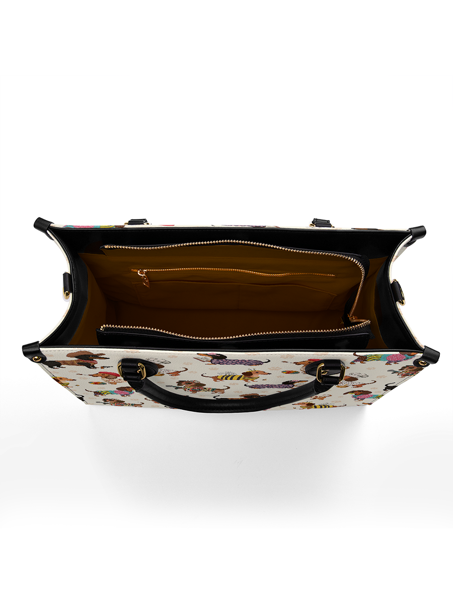 Dachshund Troupe leather bag features a lively parade of dachshunds, each dressed in whimsical costumes—from cowboys to chefs, artists to musicians—illustrated across a cream color. With its vibrant palette and joyful detail, it celebrates individuality, humor, and the irresistible charm of our four-legged friends.