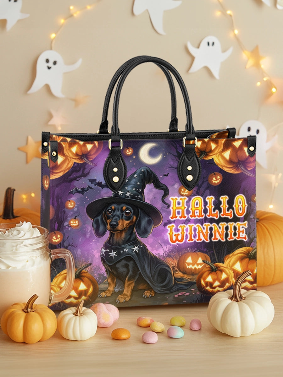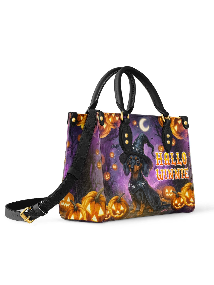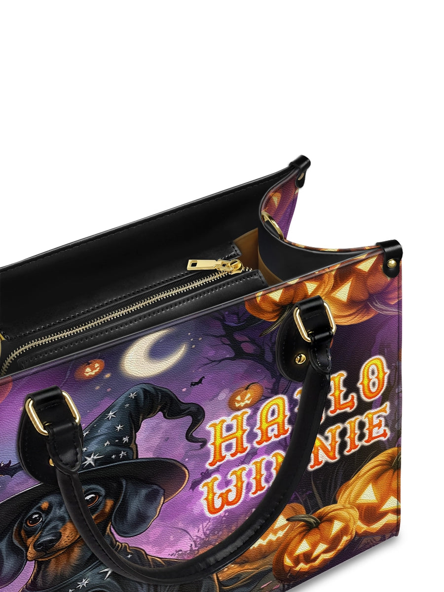 This magical leather bag features an adorable dachshund dressed as a starry witch, sitting under a glowing moon in a pumpkin-filled forest. Surrounded by carved jack-o’-lanterns and swirling purple mists, the bold “HalloWinnie” lettering adds a playful twist to Halloween night.