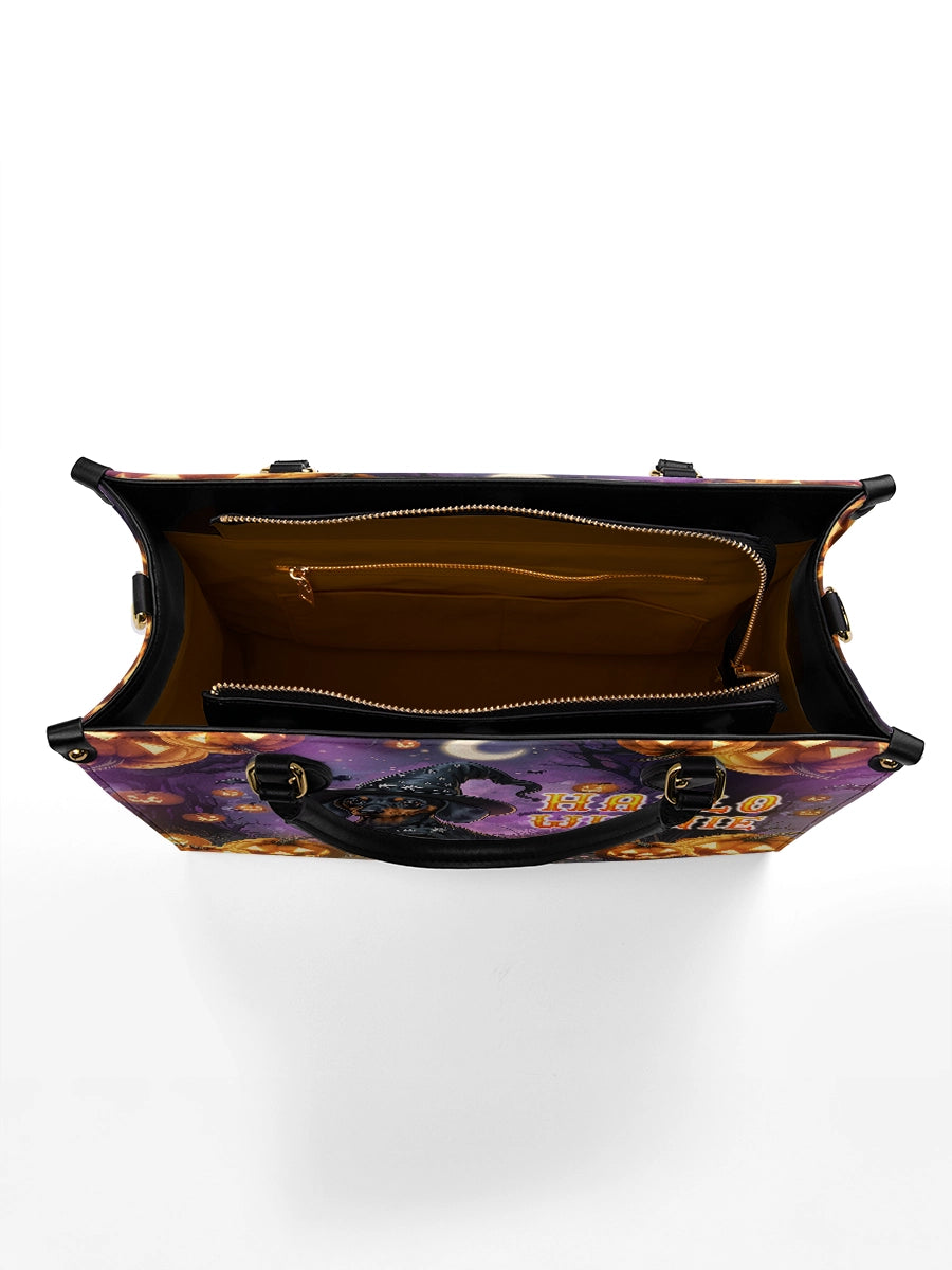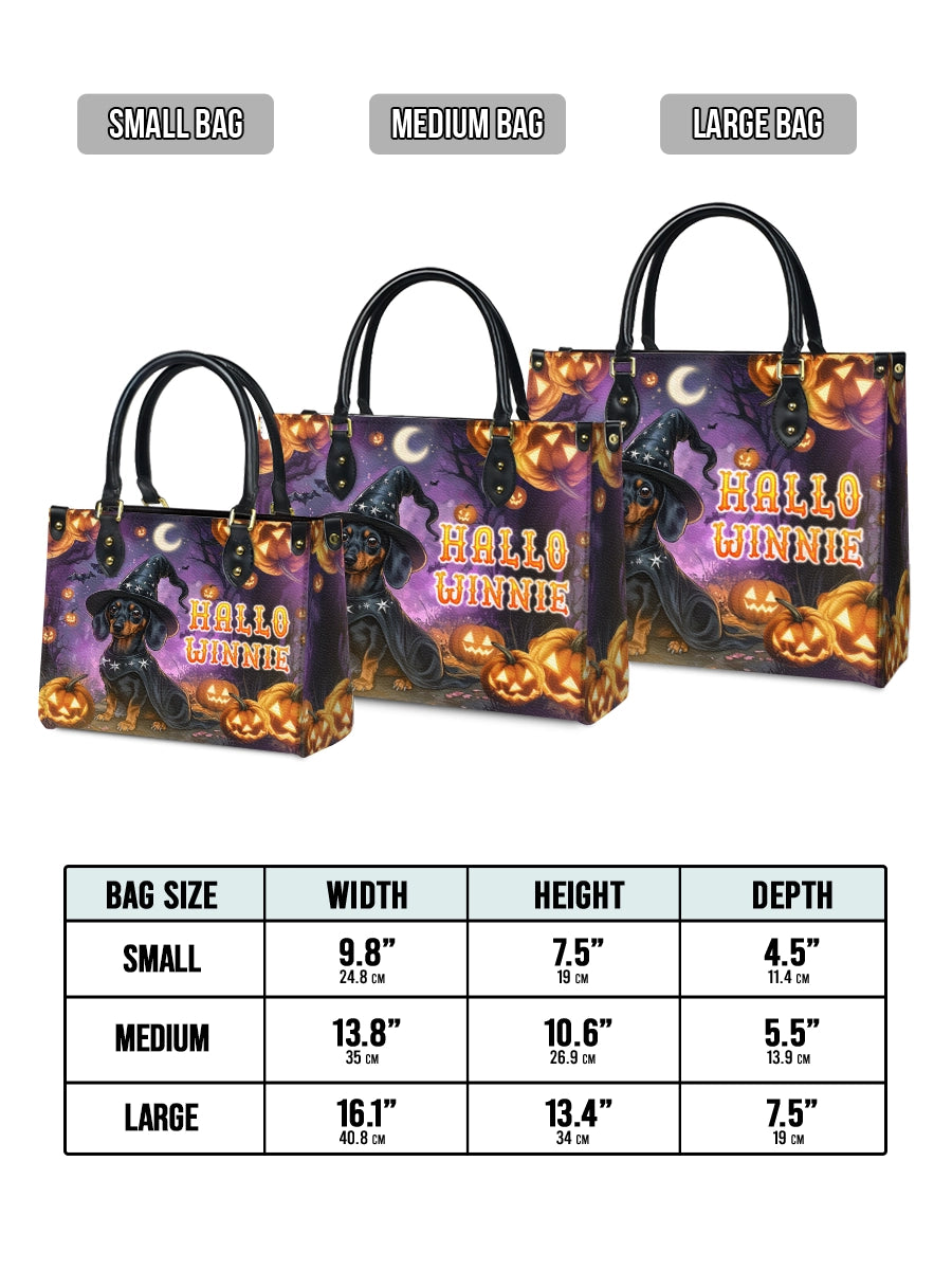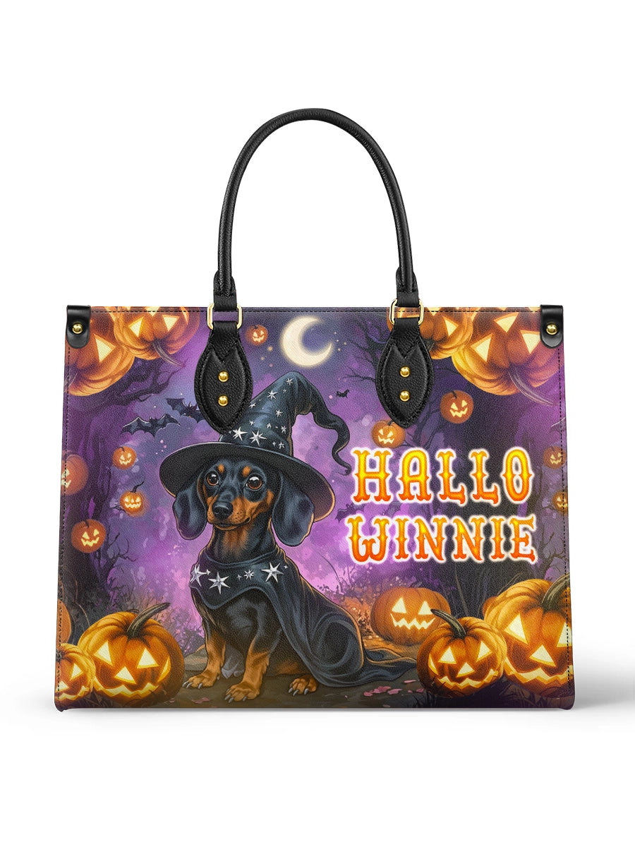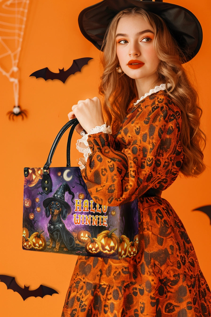 This magical leather bag features an adorable dachshund dressed as a starry witch, sitting under a glowing moon in a pumpkin-filled forest. Surrounded by carved jack-o’-lanterns and swirling purple mists, the bold “HalloWinnie” lettering adds a playful twist to Halloween night.