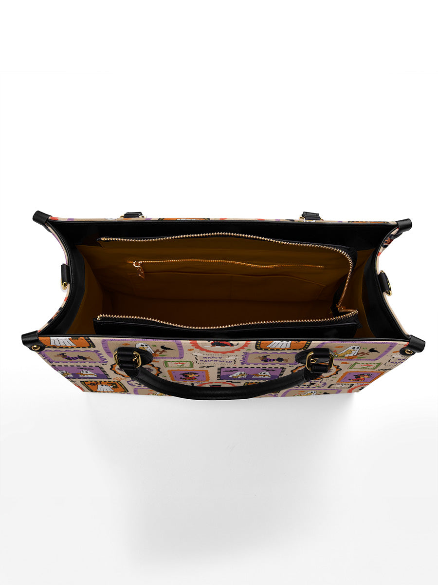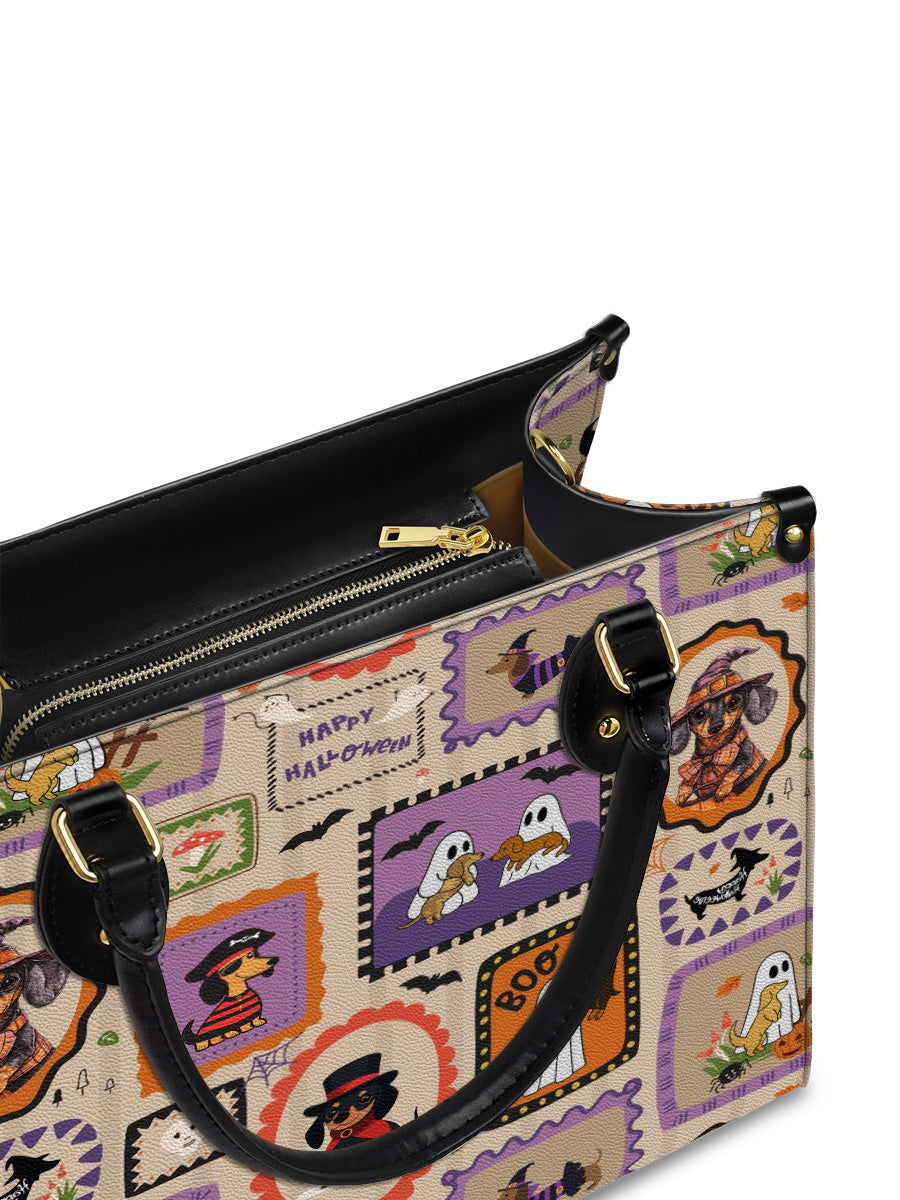 This playful leather bag features a festive patchwork of dachshunds dressed in their Halloween best — from little ghosts and witches to pumpkin pups and vampires. Framed like postage stamps and bordered with vibrant Halloween icons, it brings a nostalgic yet cheerful vibe to your autumn wardrobe.