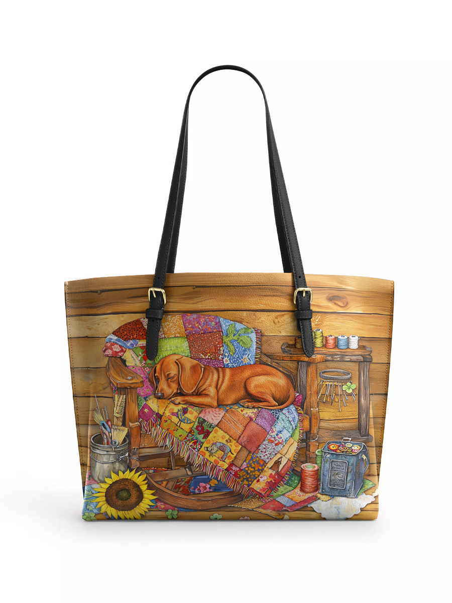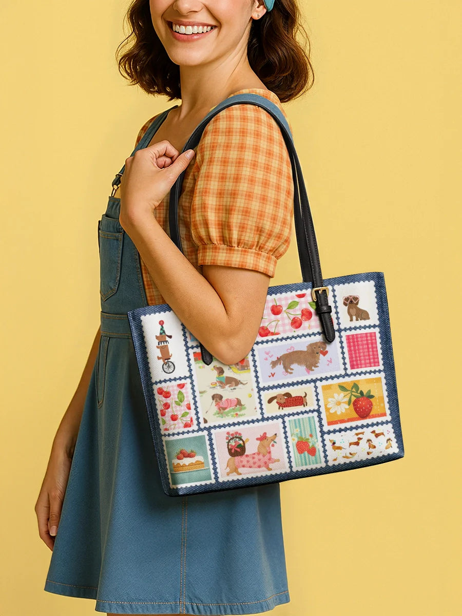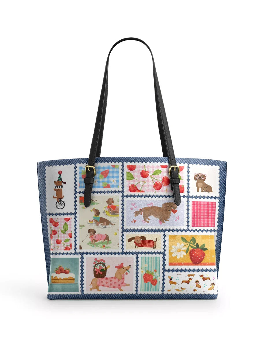DachyCharm Berry Doxie Quilt Leather Tote Bag