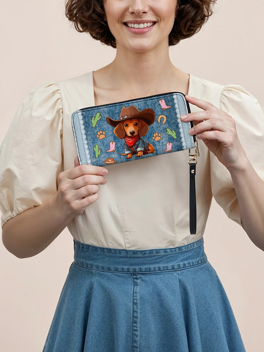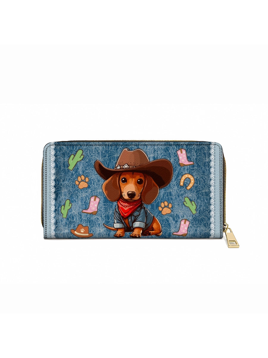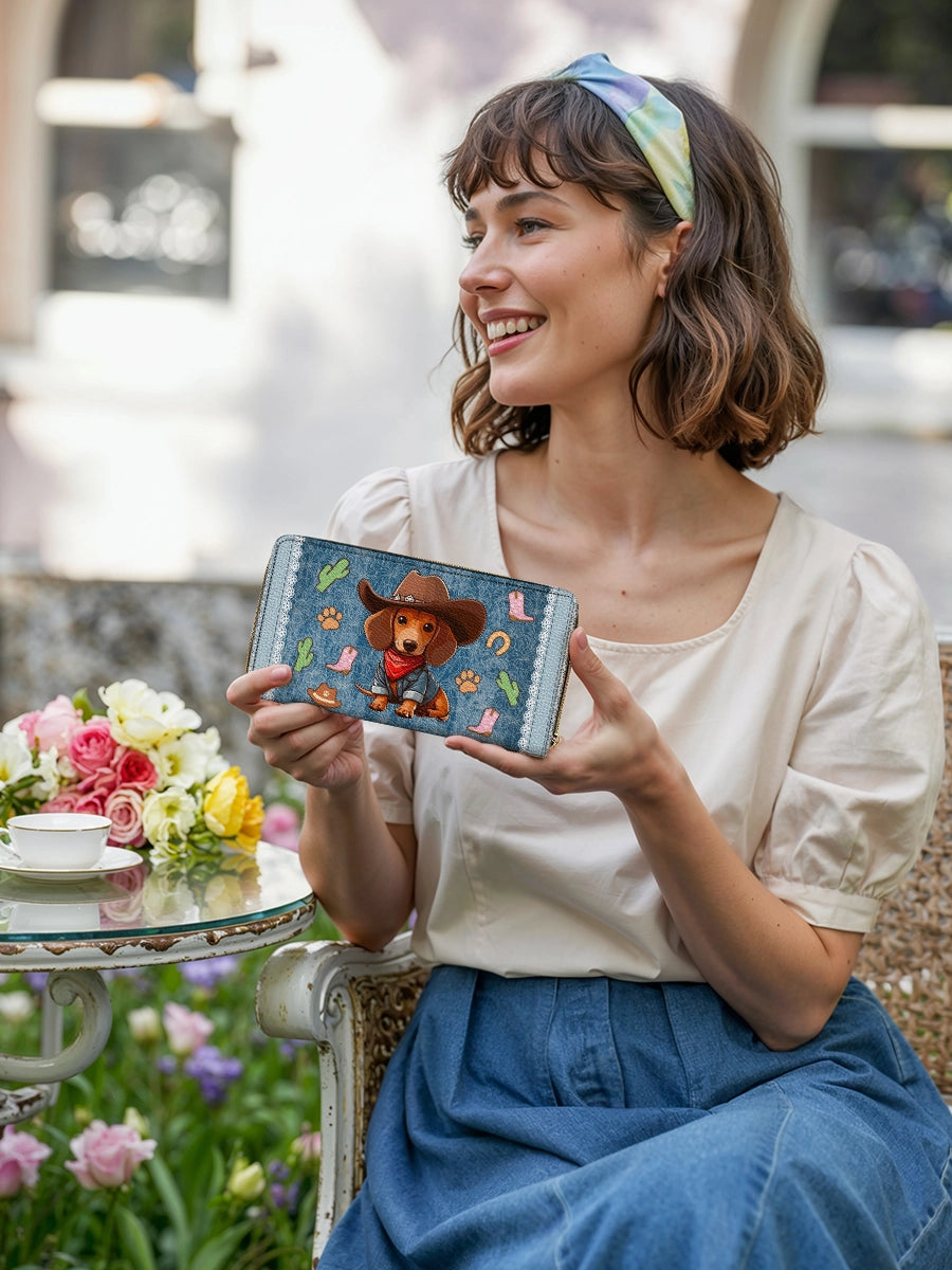 This fun-loving leather clutch features an adventurous Dachshund cowboy front and center, surrounded by western patches and stitched details on a textured denim-blue backdrop. With lace trims and a warmhearted theme, it blends whimsy with wild west flair.