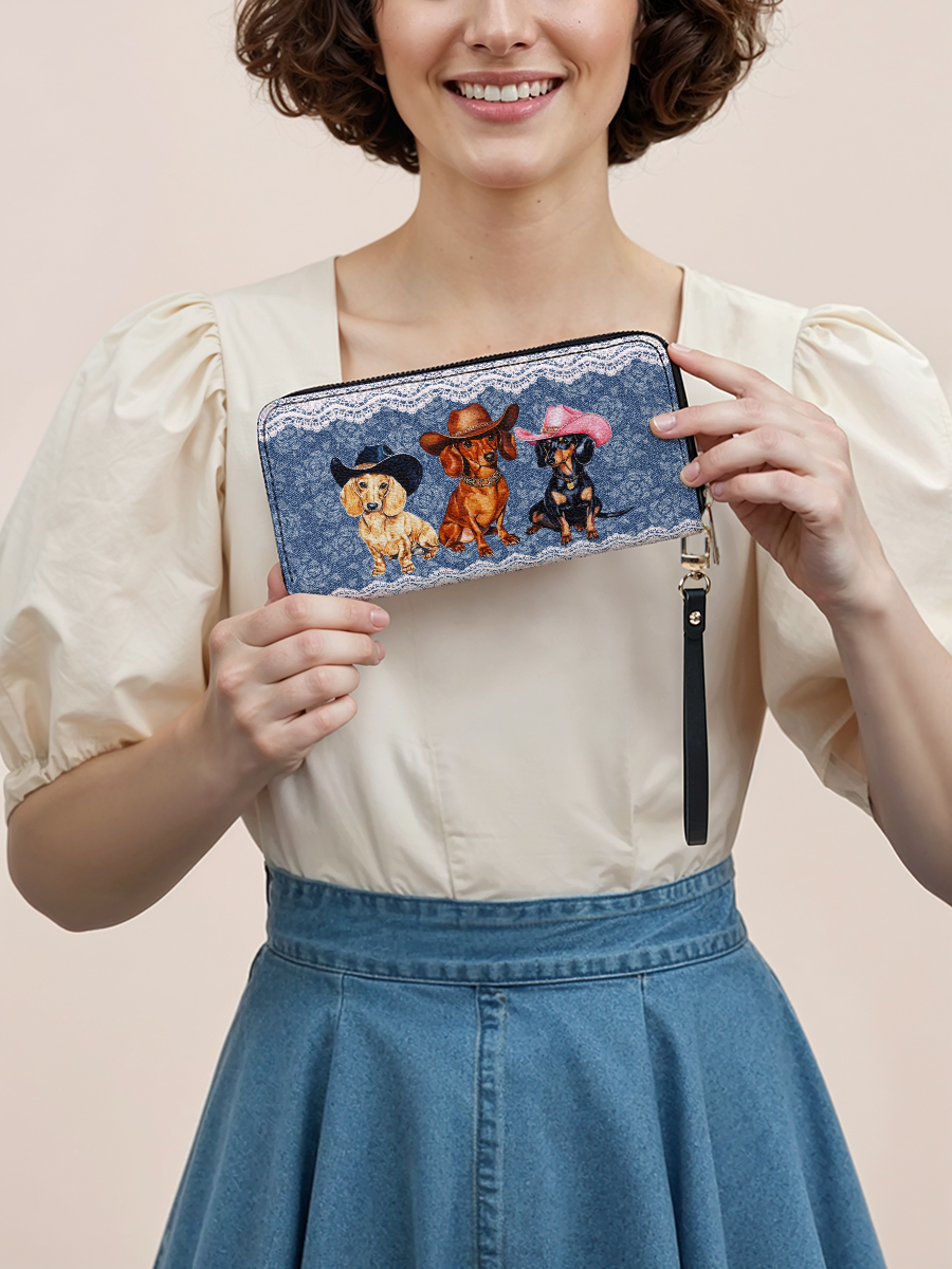 Cowgirl Crew wallet features three stylish dachshunds in cowboy hats, nestled within a denim-and-lace motif that evokes the sweet nostalgia of country living. With a romantic palette of denim blue, soft neutrals, and blush pink, it captures the beauty of blending sass with sweetness.