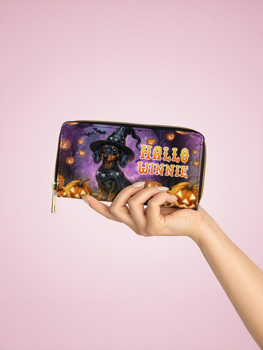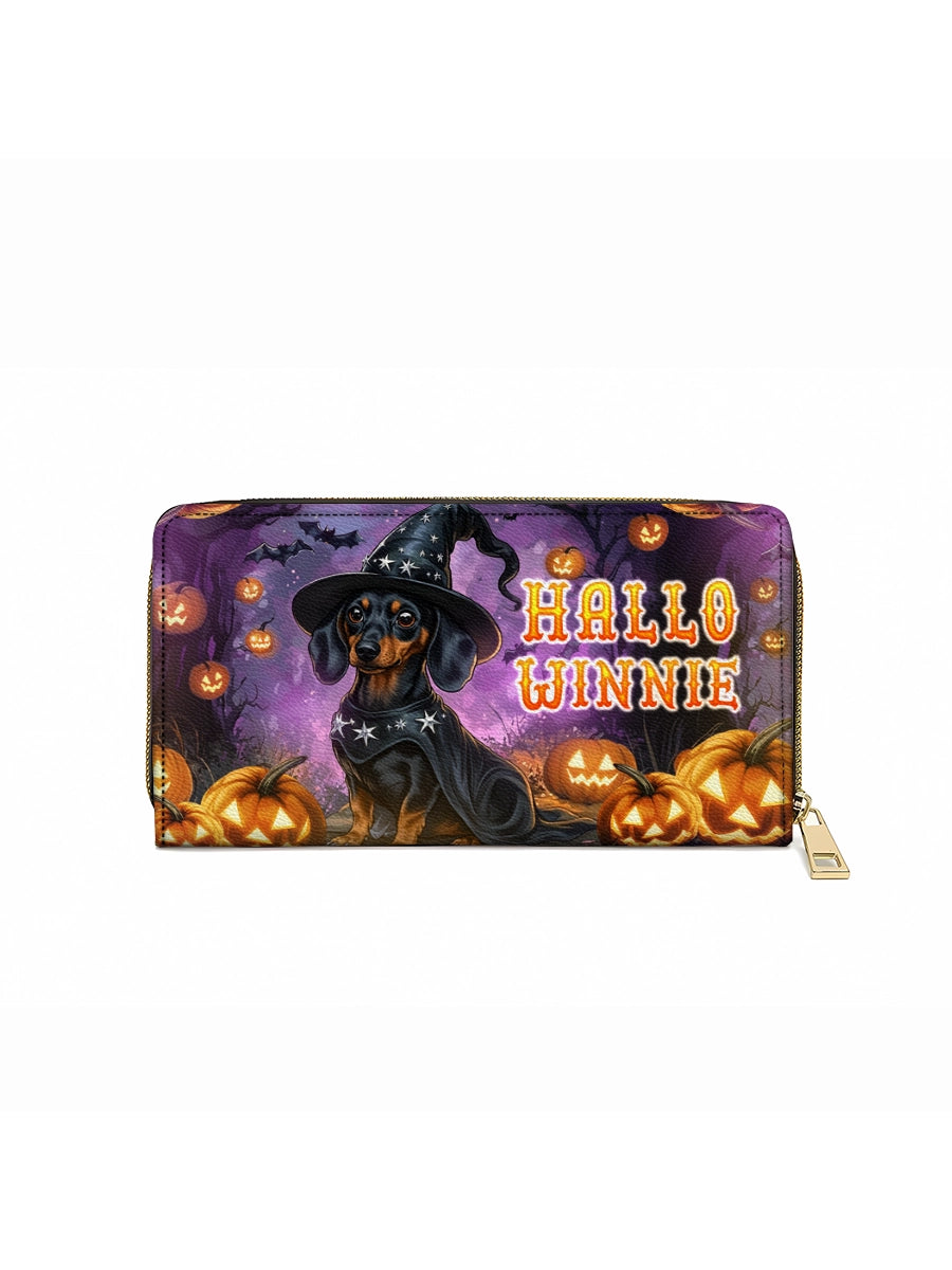 This whimsical leather wallet captures the spirit of spooky season with a sweet doxie in a witch’s hat, framed by glowing pumpkins and moonlit shadows. With its dreamy purple tones and festive charm, it brings a dash of enchantment to your daily essentials.