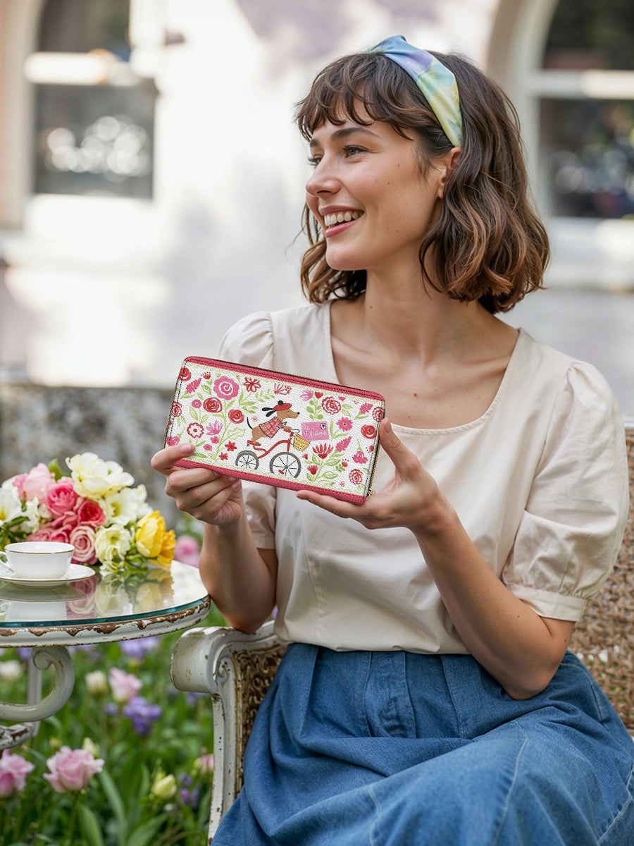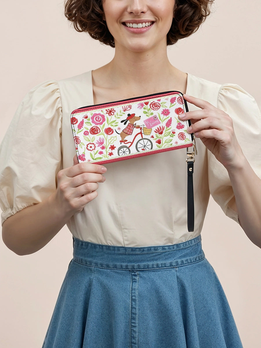 This delightful leather clutch carries the same romantic scene — a dashing Dachshund on a bicycle, surrounded by blooming florals and a message of love. With its compact form and cheerful colors, it brings a playful Parisian charm to your essentials.
