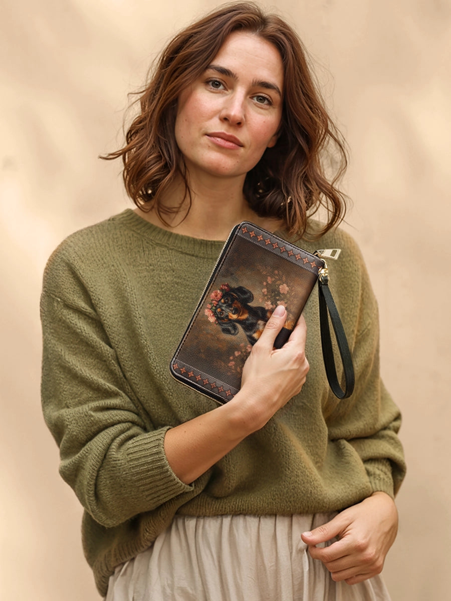The Rosewood Queen clutch captures quiet majesty in a compact form. A regal dachshund, adorned with a floral crown, gazes gently from a shadowed rose garden — framed by rich, stitched leather detailing and a touch of antique gold scrollwork.