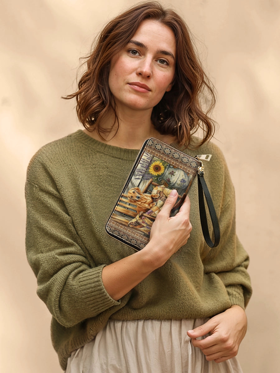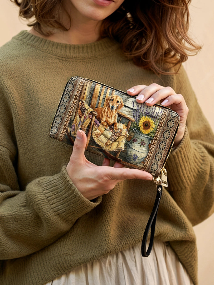 With its nostalgic setting and heartfelt detail, the Rustic Pause leather clutch invites you to carry a slice of peaceful country life wherever you go. A loyal dachshund curled on a hand-stitched quilt, paired with sunflowers and lavender, evokes the timeless magic of simple joys.