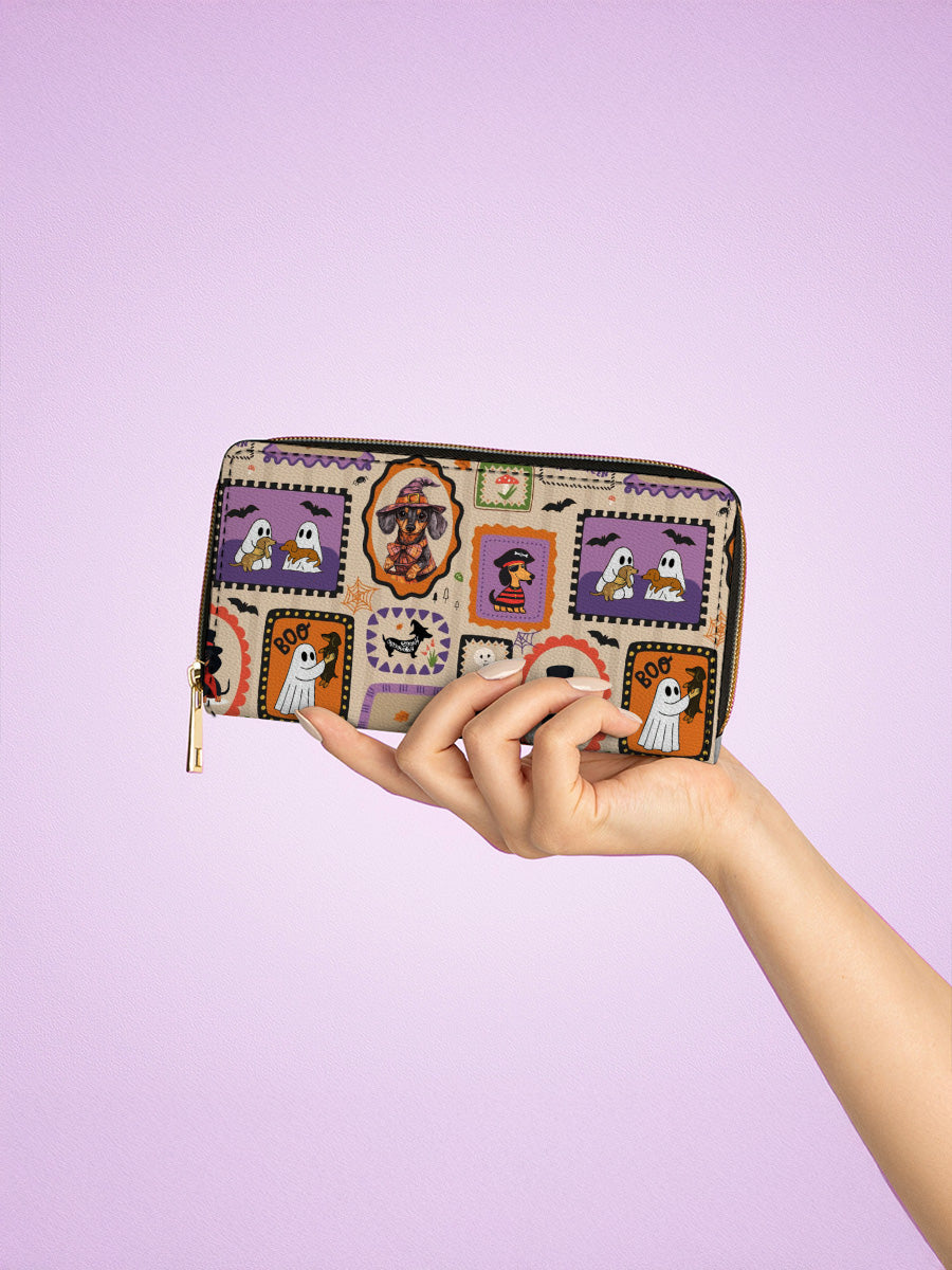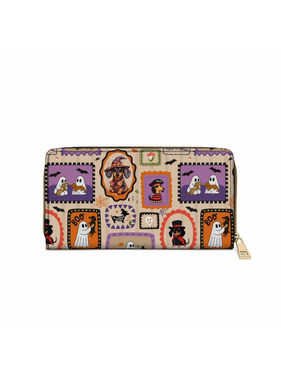 This charming leather wallet showcases tiny dachshunds in costume across a patchwork-style layout filled with ghosts, pumpkins, and cheerful Halloween accents. With its soft tones and delightful illustrations, it carries the fun of trick-or-treating in your pocket.