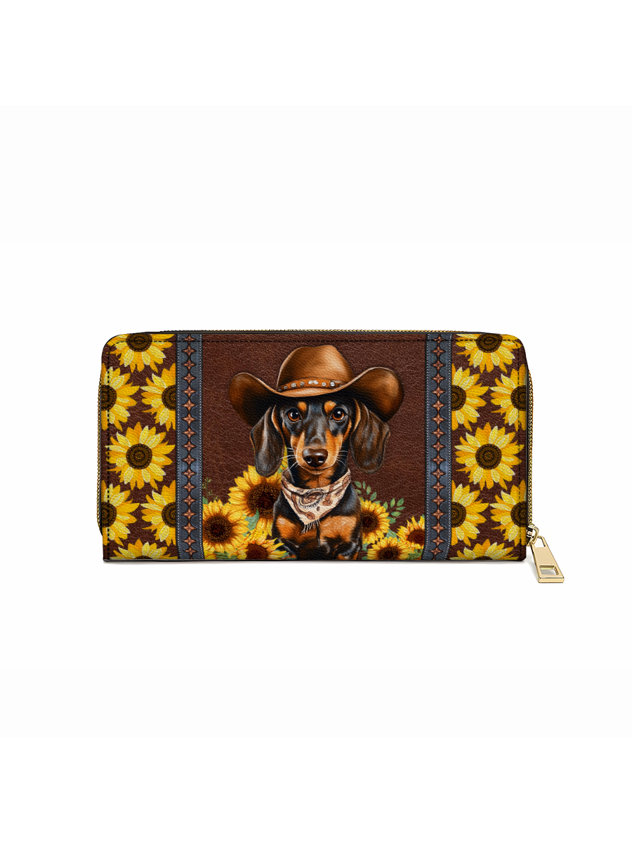 Saddle up with Sunflower Cowboy — a compact wallet that’s as bold as it is blooming. Featuring a dapper dachshund in full Western gear surrounded by sunflowers and leather textures, it’s your go-to piece for adding country soul to any moment.