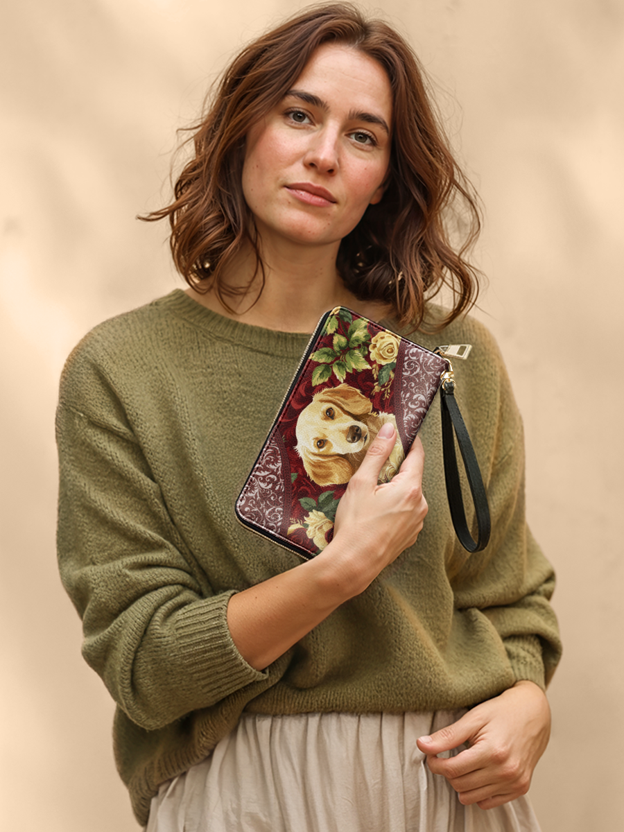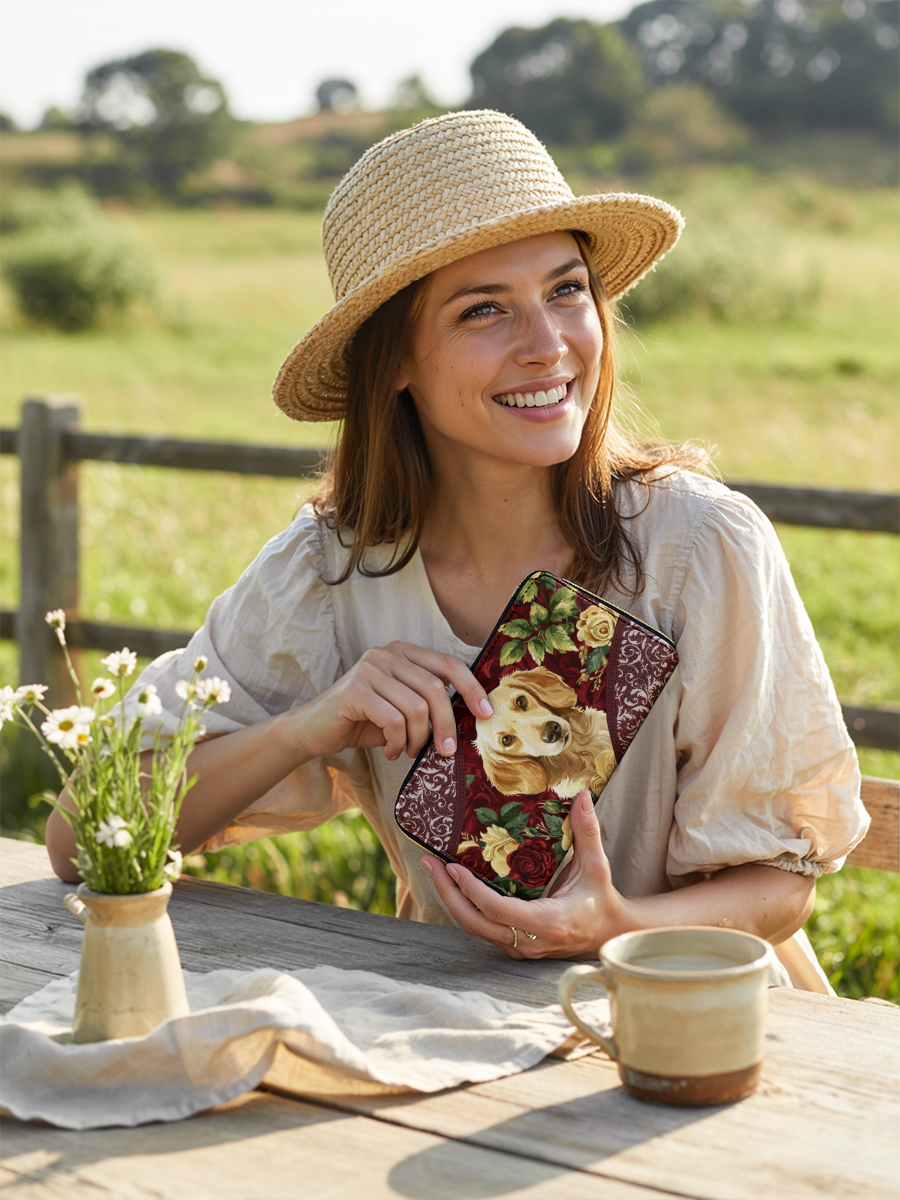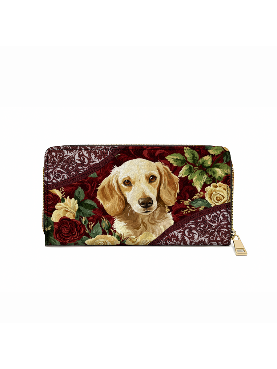 Refined and heartfelt, the Velvet Pup wallet cradles elegance in every curve. A gentle dachshund gazes sweetly from within layers of blooming roses and scrolling damask textures, evoking the aura of old-world grace.