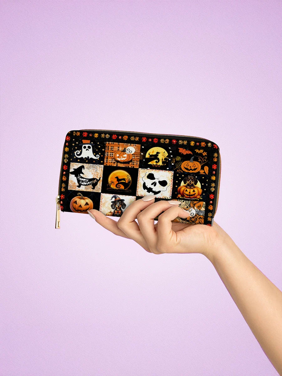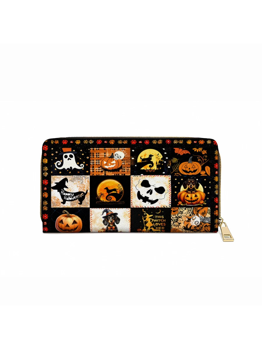 This striking leather wallet highlights Halloween magic with a grid of vivid vignettes — from spell-casting pups to glowing jack-o'-lanterns. With its moody background and detailed illustrations, it’s a compact celebration of fall’s most fun holiday.