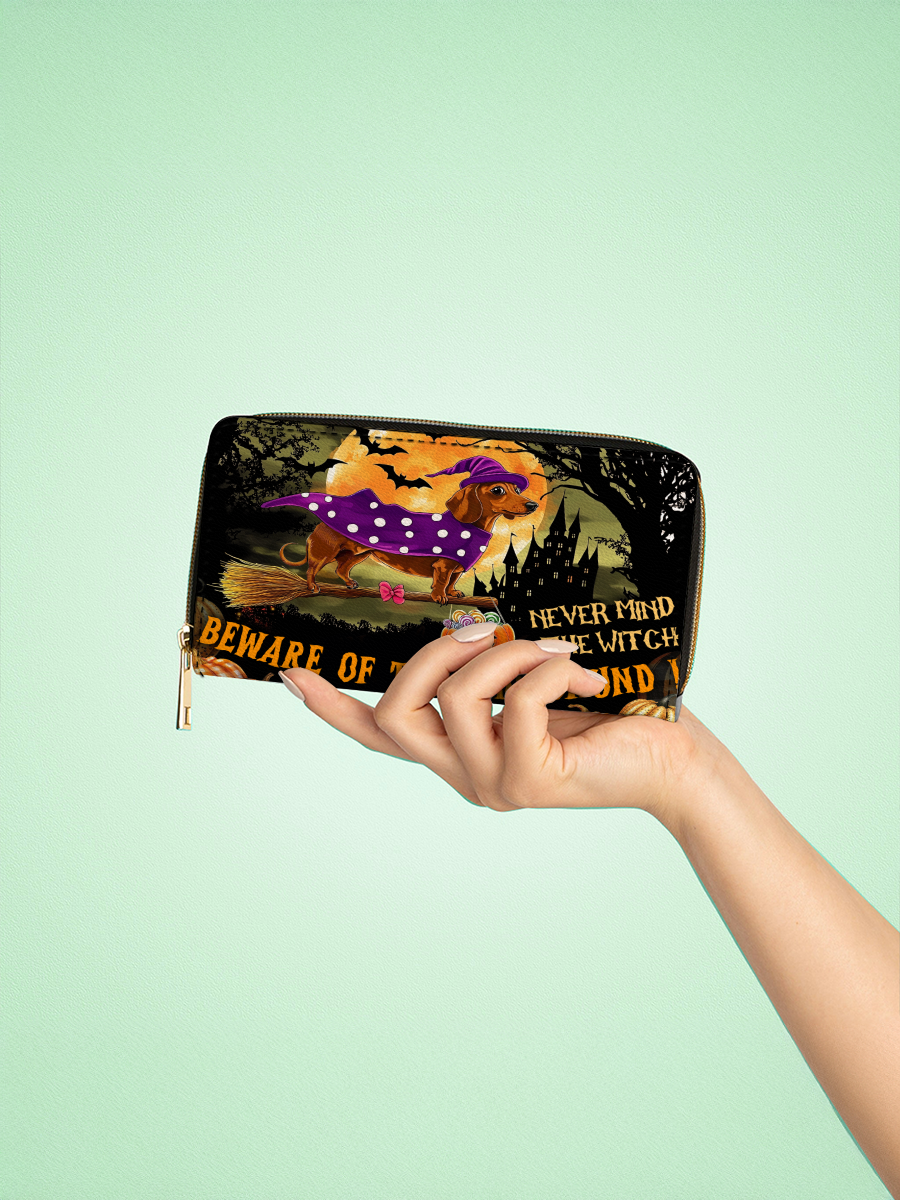 This bold leather wallet puts a spooky twist on sass - featuring a fearless dachshund witch flying under a harvest moon with her broom, cloak, and signature side-eye. Surrounded by bats, pumpkins, and a haunted castle, it’s a cheeky take on Halloween magic.