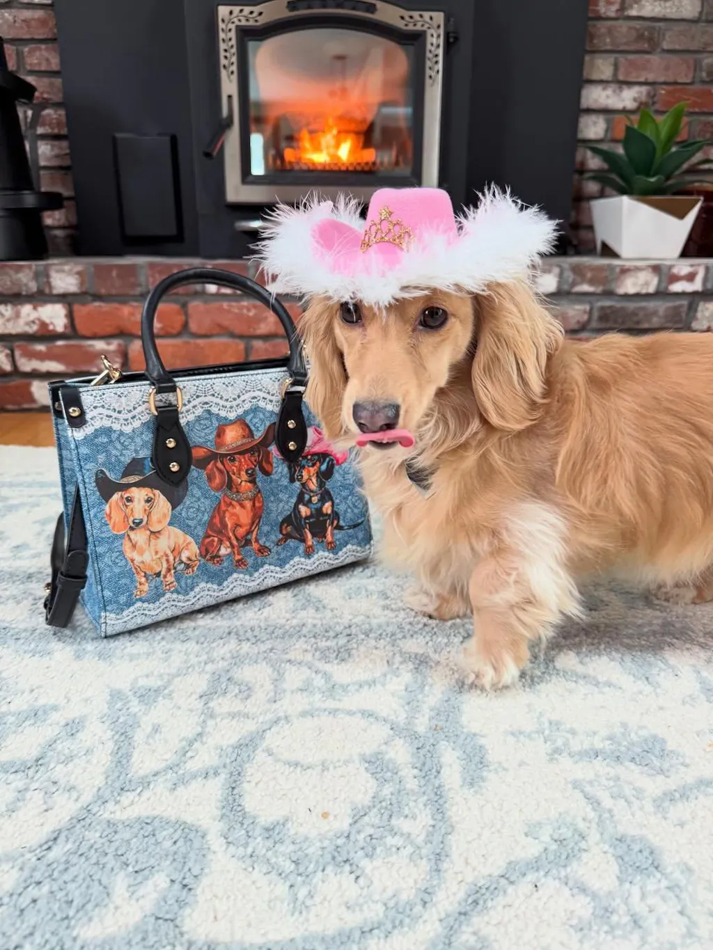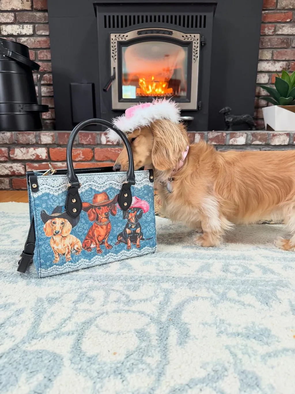 This playful leather bag features a dachshund parade gracefully illustrated within a whimsical repeating pattern. With its warm earthy hues and charming vintage flair, it tells a story of loyal companionship and joyful moments.