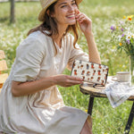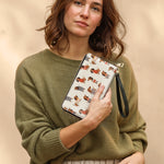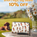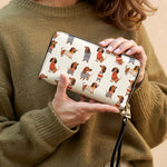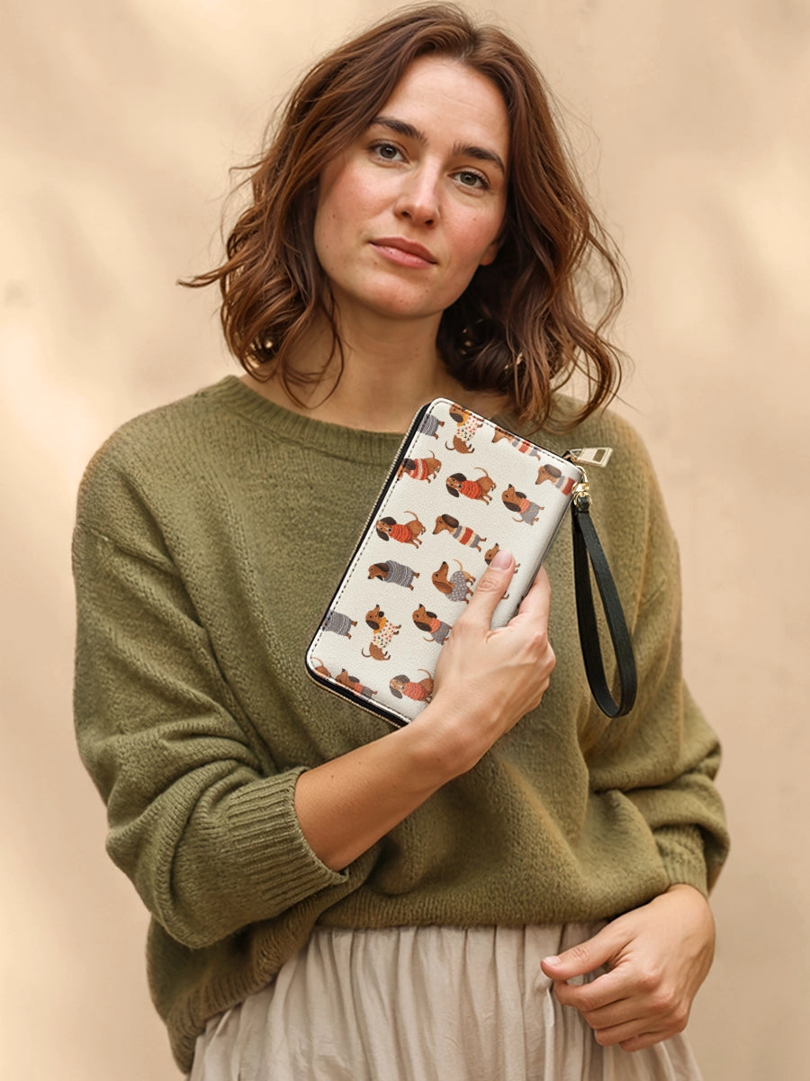 This whimsical leather clutch features a beloved dachshund motif nestled within a playful patterned design. With its soft neutrals and warm pops of color, and vintage-inspired elegance, it’s a piece that tells your story in quiet, joyful detail.