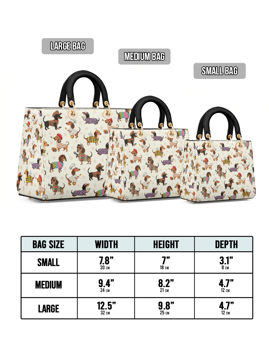 The Lady Leather Bag by DachyCharm brings timeless elegance to everyday moments. With its structured silhouette, sturdy top handles, and charming details, it’s the perfect blend of grace and personality — made for dachshund lovers who adore a touch of sophistication.