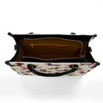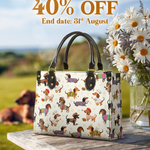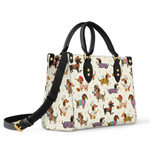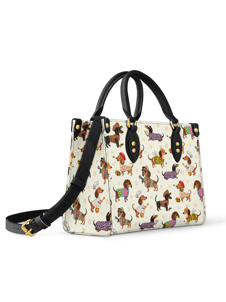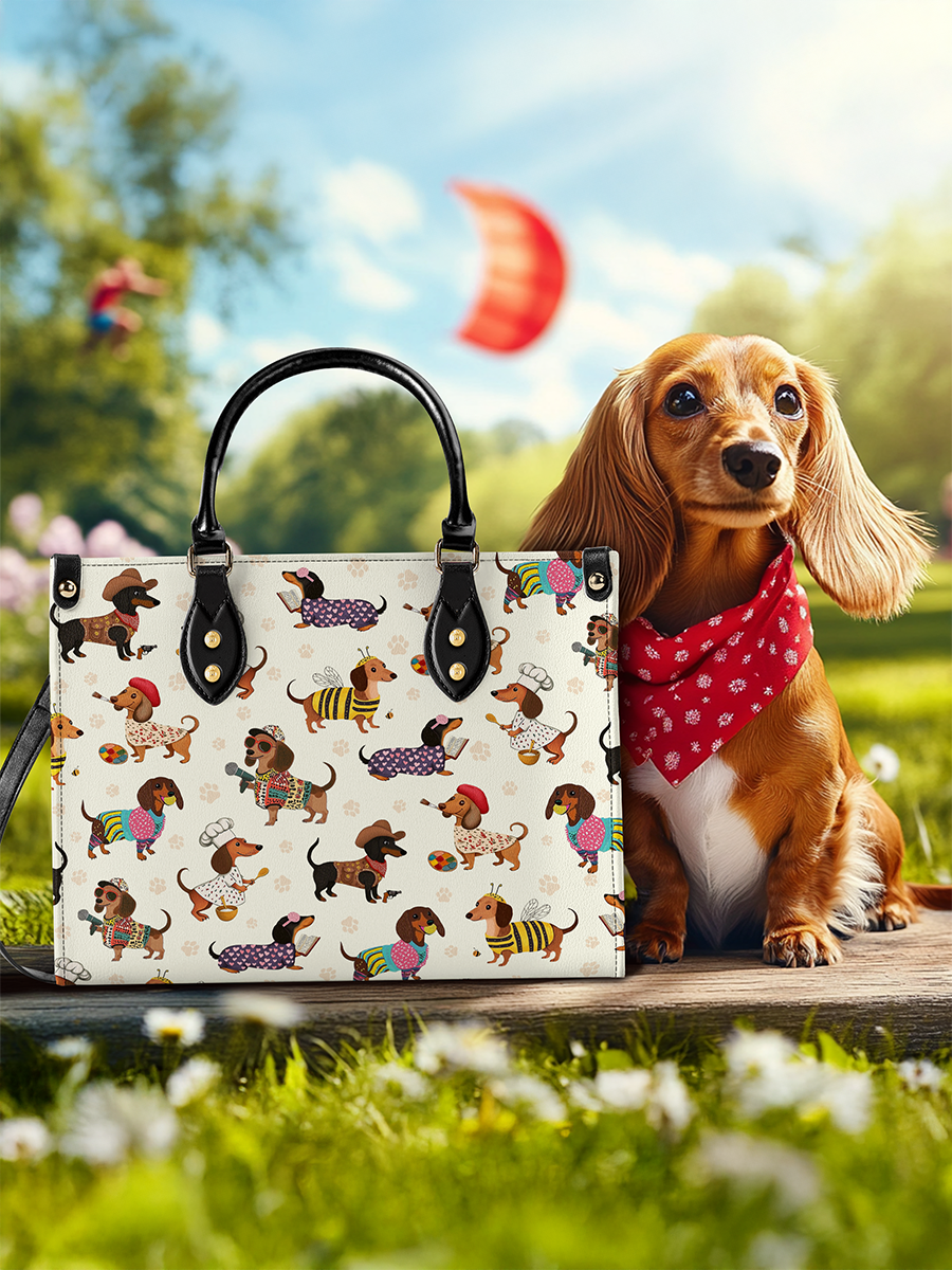 Dachshund Troupe leather bag features a lively parade of dachshunds, each dressed in whimsical costumes—from cowboys to chefs, artists to musicians—illustrated across a cream color. With its vibrant palette and joyful detail, it celebrates individuality, humor, and the irresistible charm of our four-legged friends.