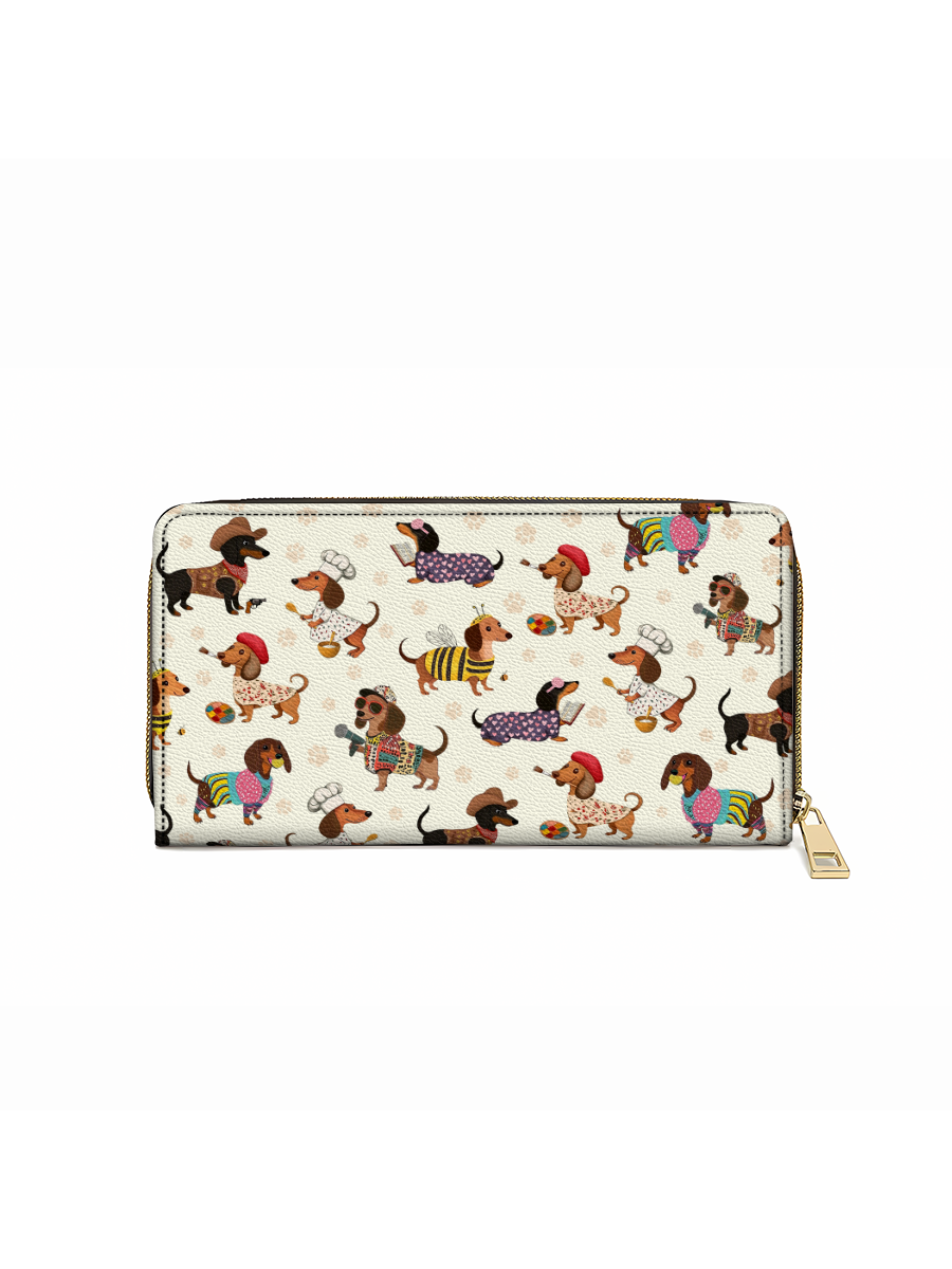 Dachshund Troupe wallet features a collection of dachshunds in colorful costumes, each full of character and flair. With its creamy background and bold pops of color, it brings a lighthearted energy and a sense of fun wherever you go.