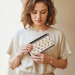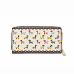 With its parade of colorfully dressed dachshunds, the Doxie Parade wallet is a little bundle of joy in your hand. Each pup struts across the cream backdrop in adorable hats, coats, and patterns — bordered by scalloped hearts and vintage flair.
