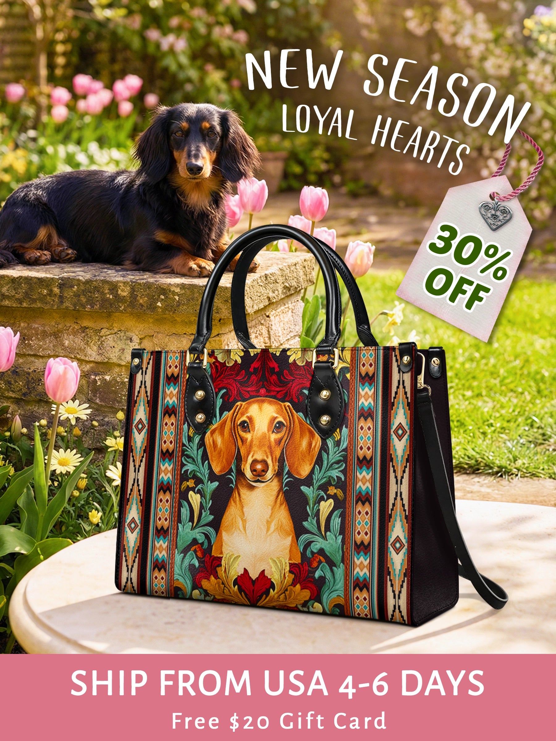 Doxie Spirit leather bag features an adorable dachshund nestled within a vibrant Western-tribal tapestry. Surrounded by bold patterns and earthy tones of terracotta, turquoise, and deep black, the artwork radiates charm, cheer, and a sense of joyful individuality.