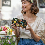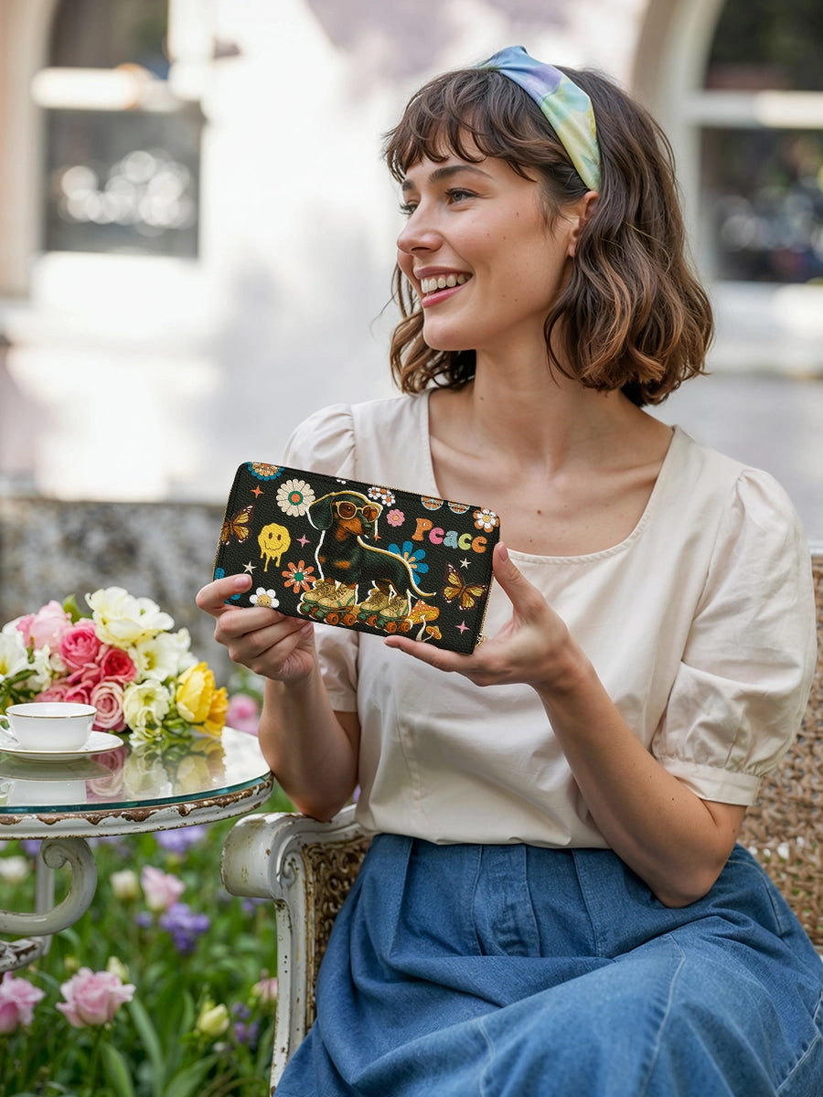 This funky leather clutch captures the same upbeat vibe — a dachshund with major disco energy, cruising on wheels amidst flower power and retro charm. Its compact size makes it the perfect sidekick for festivals, weekend strolls, or any moment you want to channel groovy goodness.