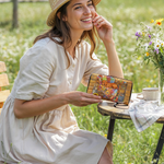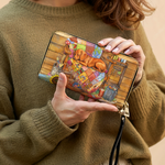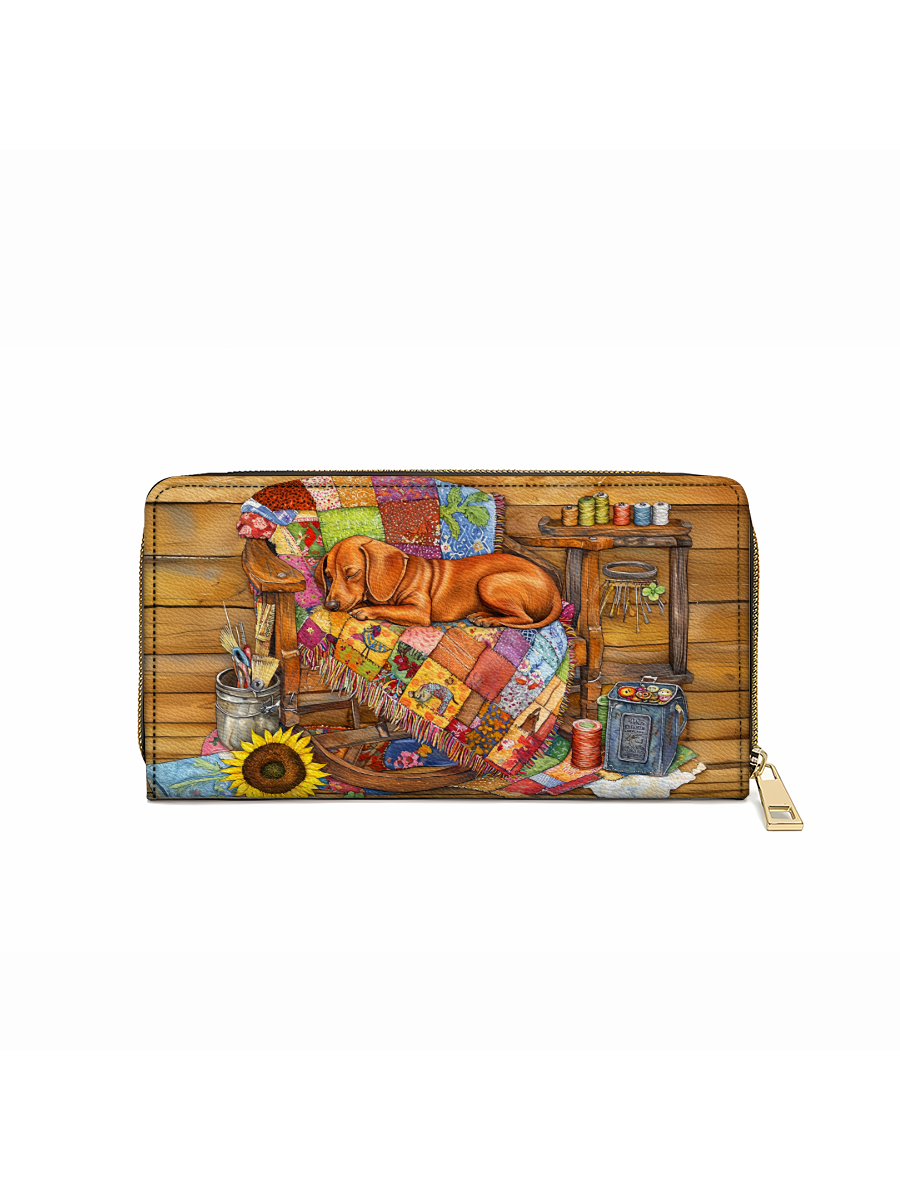 Patchwork Nap wallet features a beloved dachshund curled up on a handmade quilt in a rustic, homely nook. With its cozy color palette and artisan-inspired details, it’s a piece that tells your story in quiet, beautiful detail.