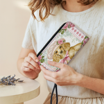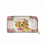 Petite and precious, the Rosalia Pup leather wallet feels like a love letter from another era. With a golden dachshund in her Sunday best — bonnet, lace, and all — framed by classic roses and vintage scalloped borders, it’s the perfect blend of charm and grace.