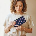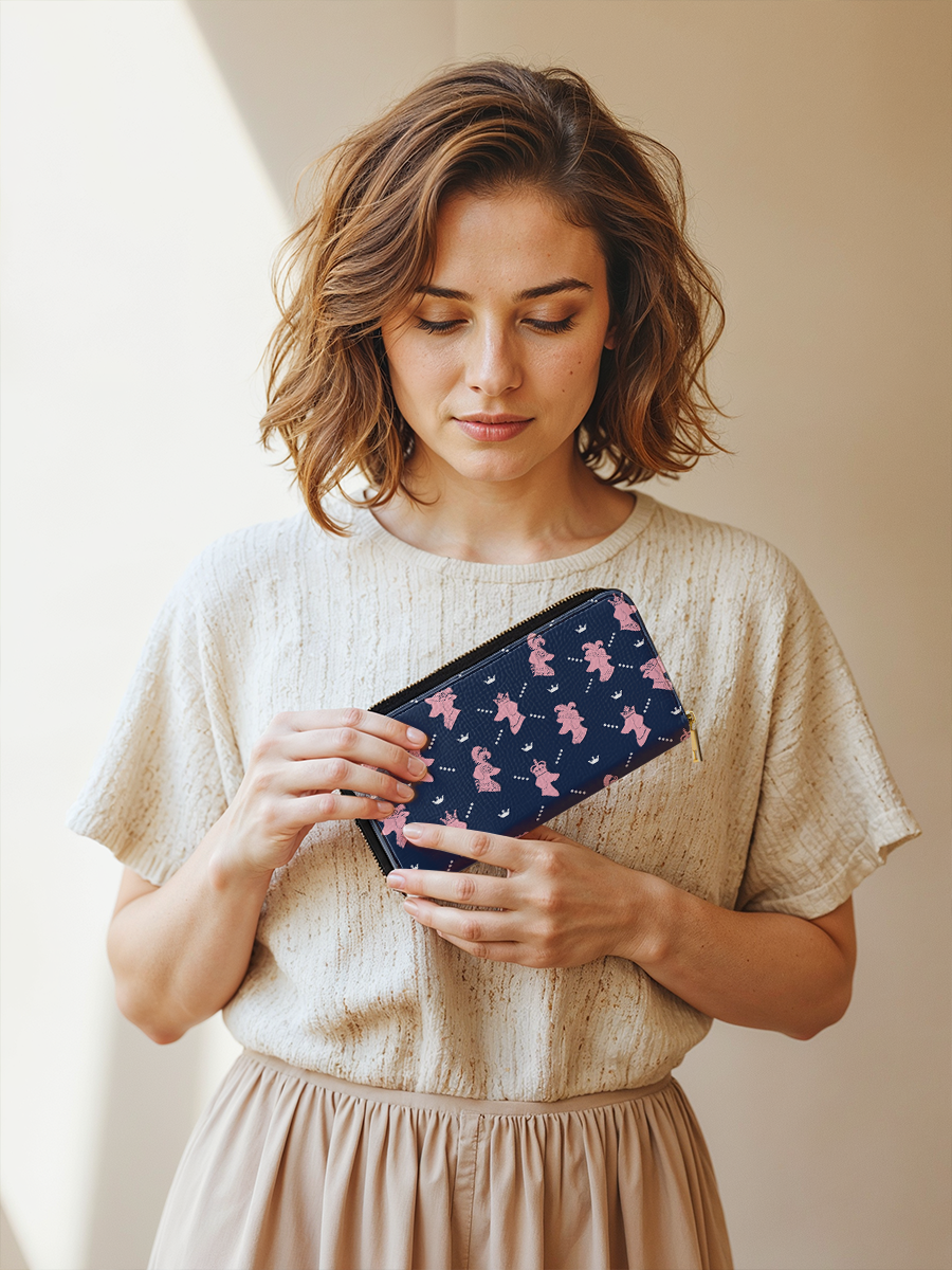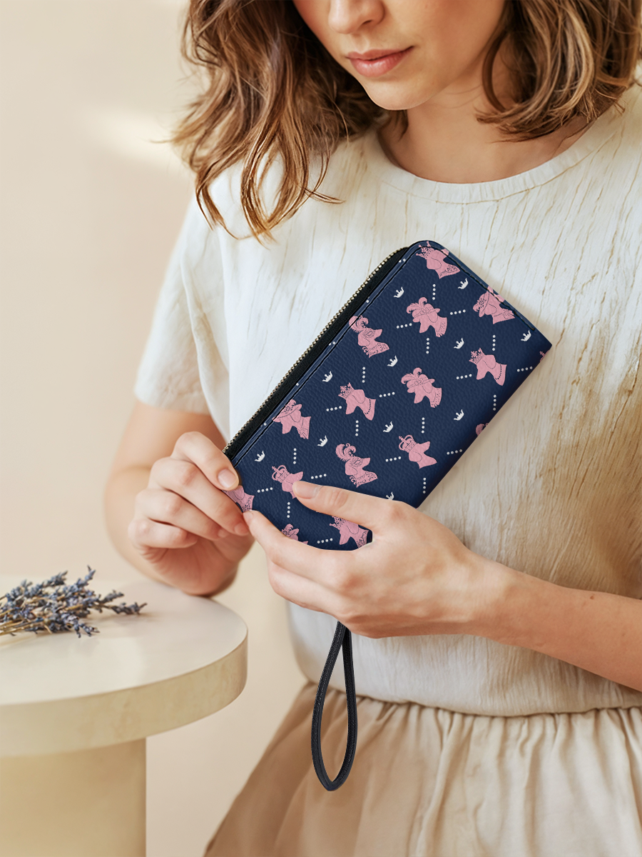 Bold, cheeky, and undeniably chic, the Royal Pawty wallet brings noble flair to your fingertips. With pink dachshunds in royal attire dancing across a navy canvas, it's equal parts runway-ready and puppy-playful.