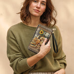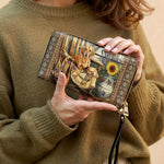 With its nostalgic setting and heartfelt detail, the Rustic Pause leather clutch invites you to carry a slice of peaceful country life wherever you go. A loyal dachshund curled on a hand-stitched quilt, paired with sunflowers and lavender, evokes the timeless magic of simple joys.