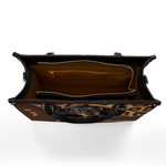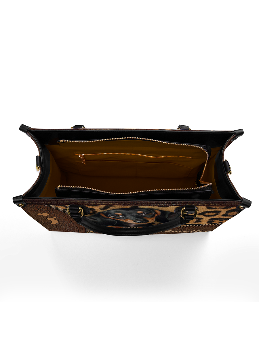 Sassy Doxie leather bag features a black and tan dachshund gracefully illustrated within a faux leather zip frame and leopard print backdrop. With its earthy browns and wild pattern contrasts, it tells a story of playful elegance and fierce loyalty.
