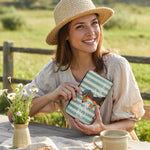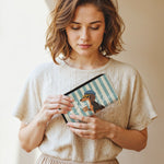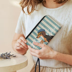 This compact leather clutch carries the same French-inspired whimsy, featuring the fashionable Dachshund against soft striped tones. Whether you're sipping lattes or heading out for a light afternoon, this clutch adds personality to your day — with just enough room for the essentials.
