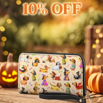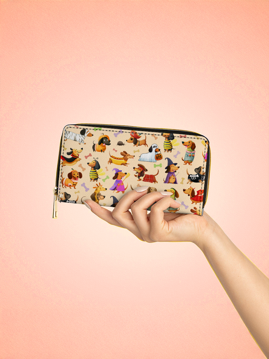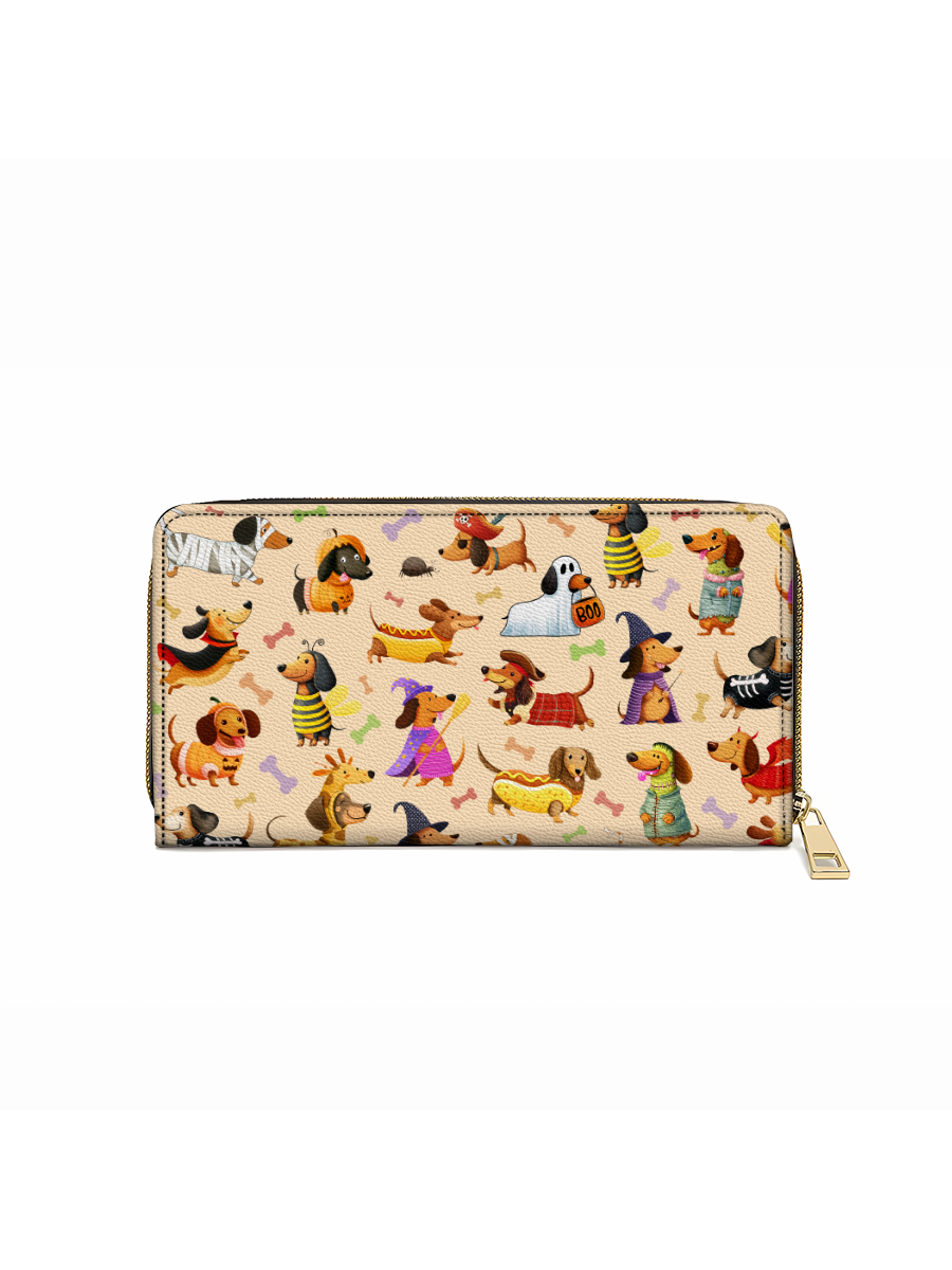 This cheerful leather wallet turns Halloween into a parade of pups - featuring a lively cast of dachshunds dressed as mummies, ghosts, witches, and more. Set against a soft beige background with scattered bones, every inch is a celebration of spooky joy and puppy playfulness.