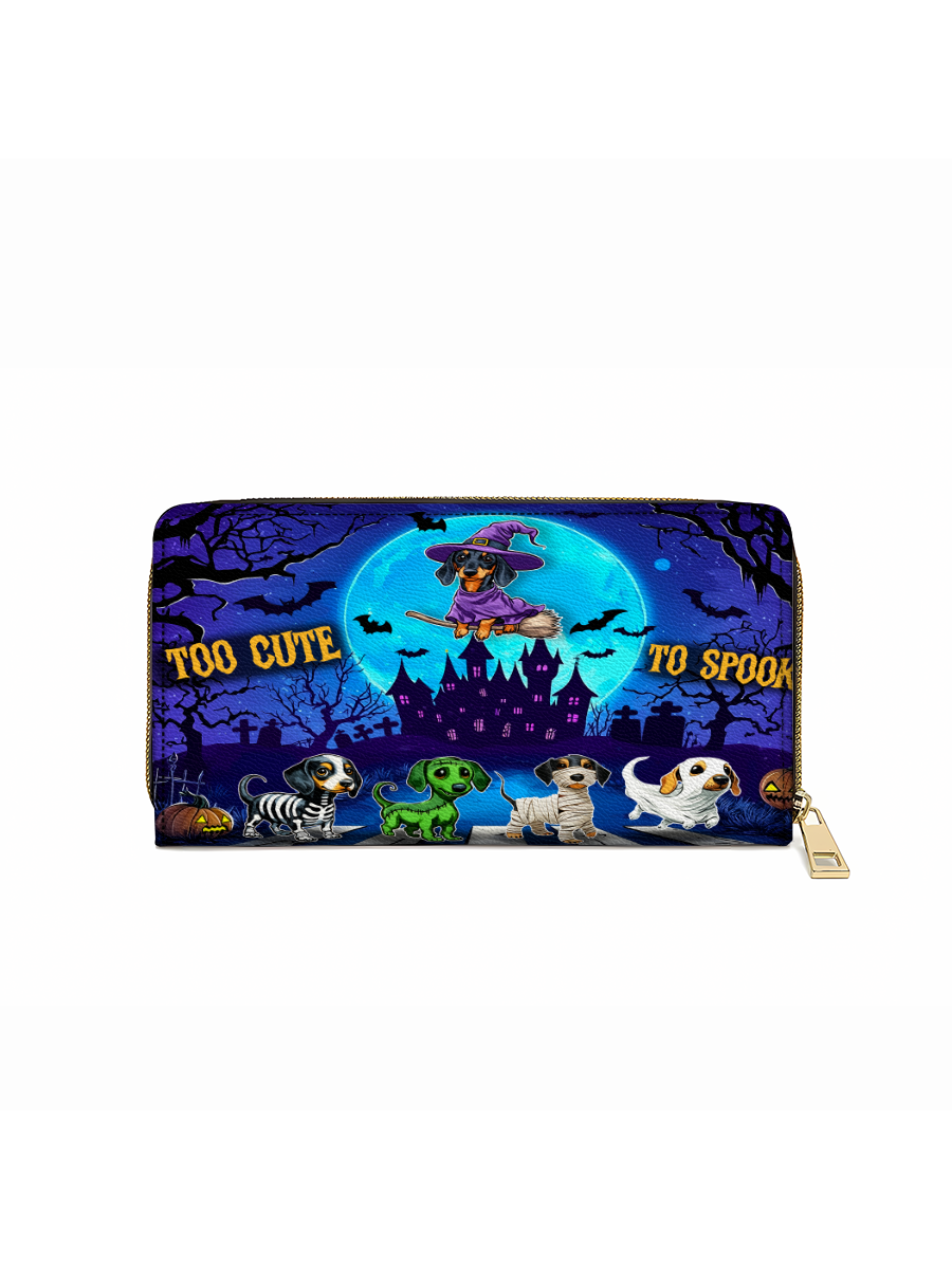 This glowing leather wallet lights up the night with a spooky-sweet charm - featuring a flying dachshund witch above a haunted castle and a gang of costumed pups below. From skeletons to mummies, every detail pops against a moonlit sky in deep, enchanting blue.